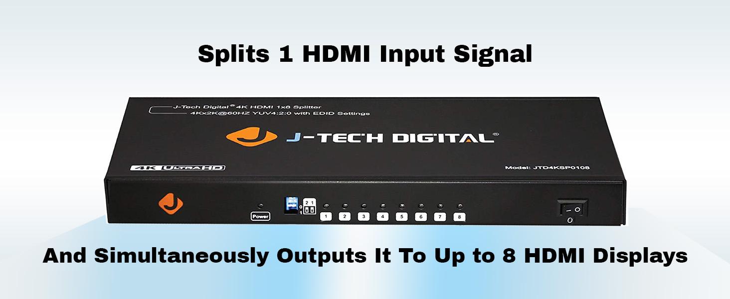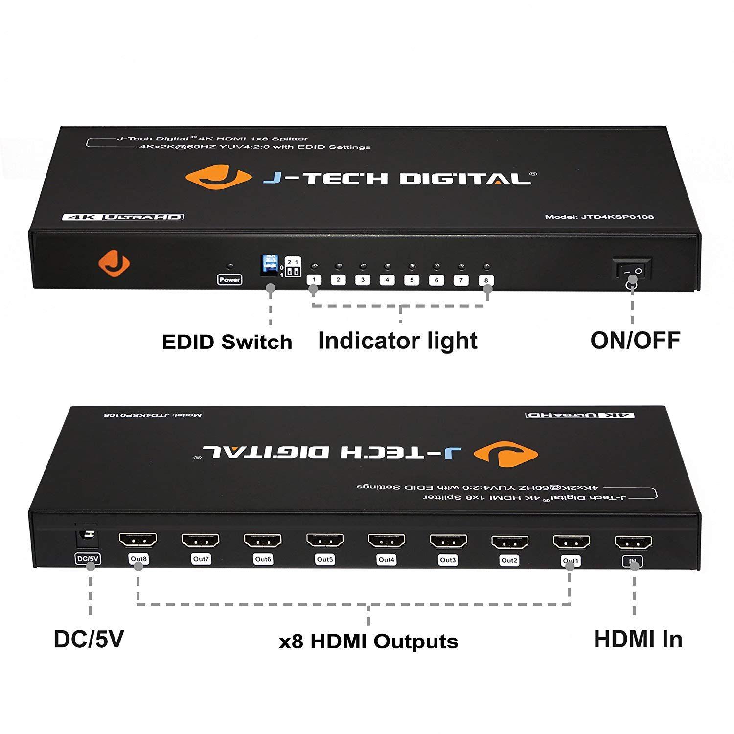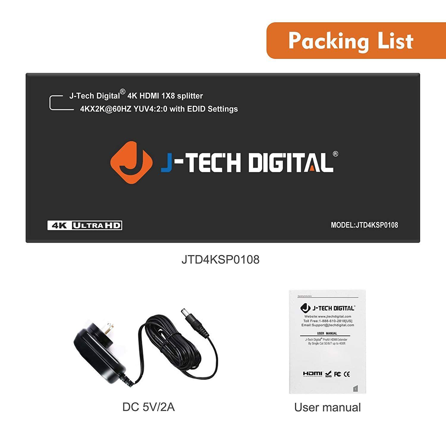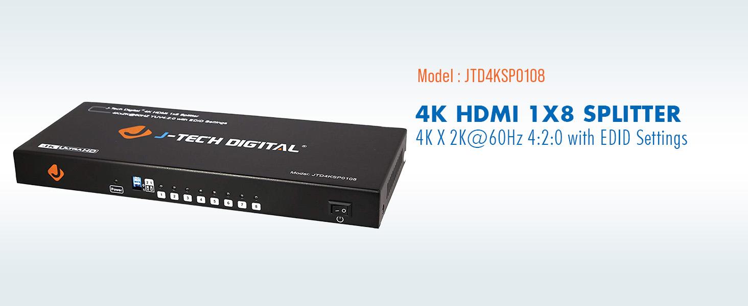 The J-Tech Digital JTD4KSP0108 HDMI Splitter is a product which can distribute HDMI signal without loss to one or more display terminal device such as HDTV. It can optimize your home theatre system to the best effect. Fully HDMI 1. 4 Specification compliant. It is applicable to source device and high definition display terminal device such as Blu-ray Players and HDTV which have HDMI interfaces or digital interfaces. Supports high resolutions up to 4Kx2Kat30Hz, including 480i/P, 576i/P, 720i/P, 1080i, 1080p; Supports 12-bit Deep Full HD, Full 3D and 4Kx2K video; supports standard Audio, DSO Audio, HD (HBR) Audio. Extend the transmission distance and improve transmission signal with ease.