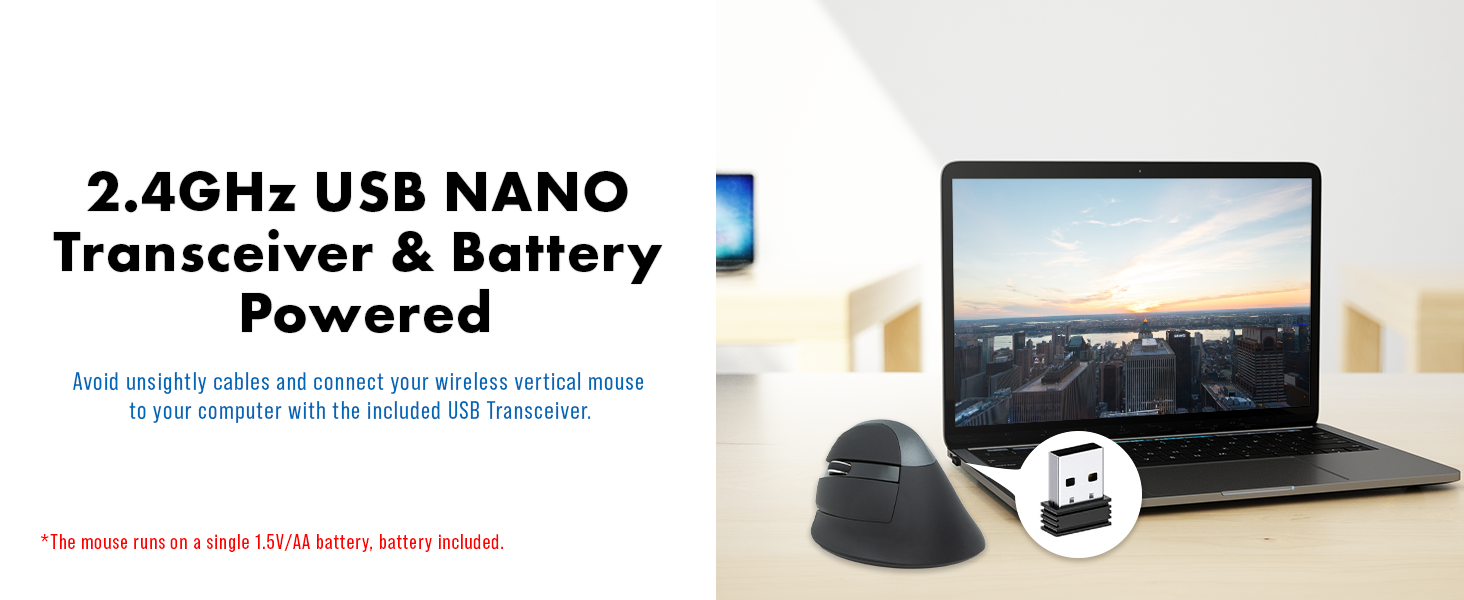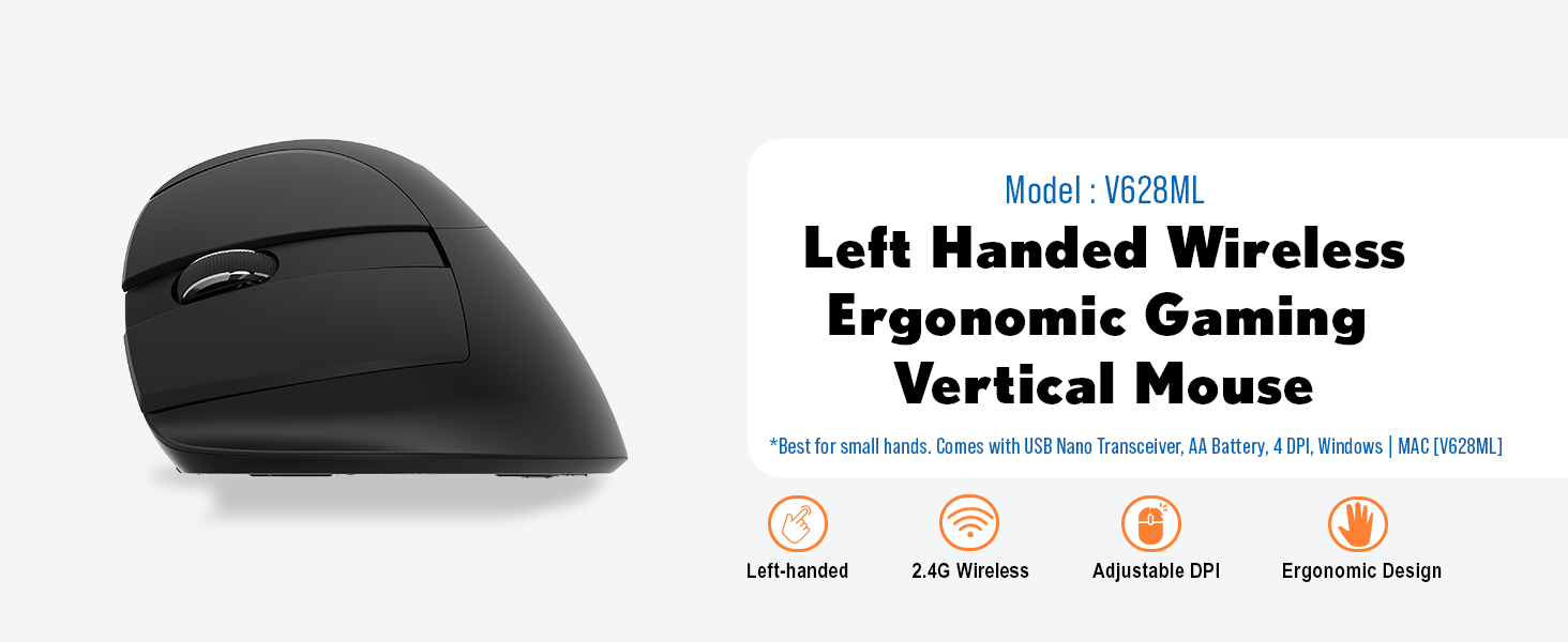 The V628ML Left Handed Ergonomic Vertical Mouse connects to your Windows PC, Mac or Linux computer wirelessly via the included 2.4 GHz nano USB transceiver and eliminates any need for unsightly cables. Toggle through three DPI sensitivity settings (800 | 1200 | 1600) via the DPI button found on the left hand ergonomic mouse to find the setting best suited for you. Optional DPI settings and operating system flexibility make the V628ML one of the best left handed gaming mouse options.