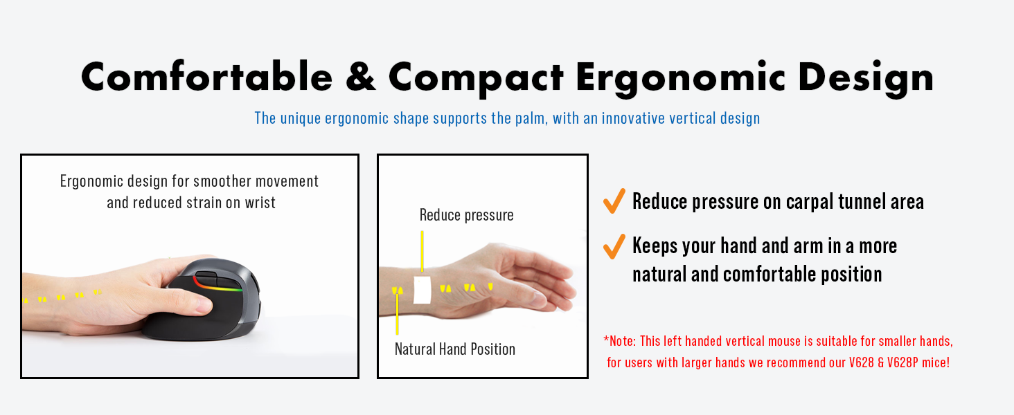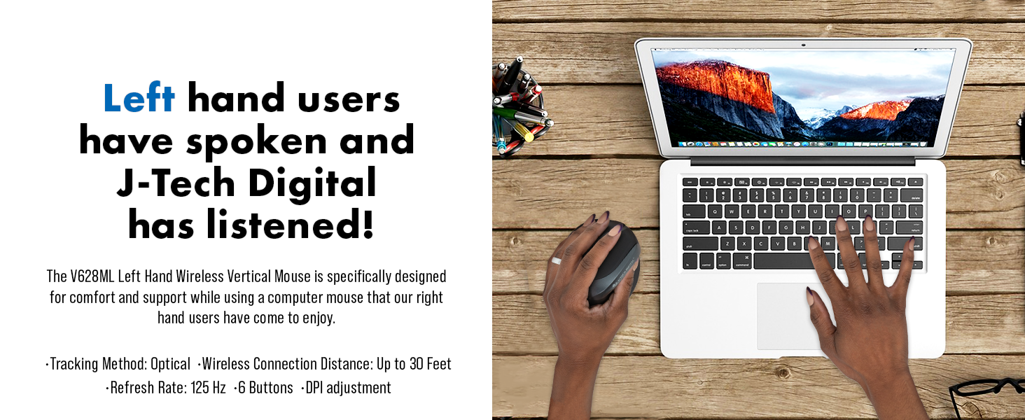J-Tech Digital is proud to introduce the V628ML – Left Handed Wireless Vertical Mouse. Left hand users have spoken and J-Tech Digital has listened! The V628ML Left Hand Wireless Vertical Mouse is specifically designed to offer J-Tech Digital left hand mouse users the same ergonomic comfort and support while using a computer mouse that our right hand users have come to enjoy.