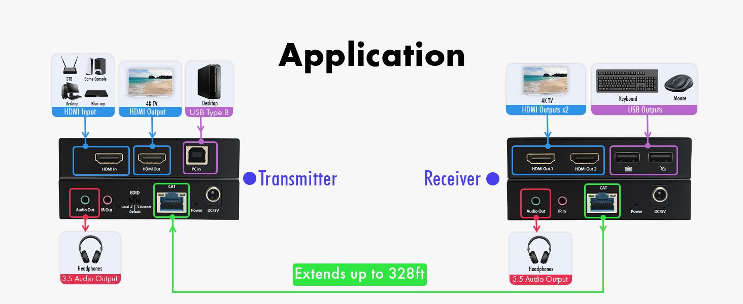 ✅ Input Ports – (1) TX – 1 x HDMI In | 1 x USB 2.0 Type-B (2) RX – 1 x HDMI | 1 x RJ-45 | 1 x IR In | 2 x USB 2.0 Type-A