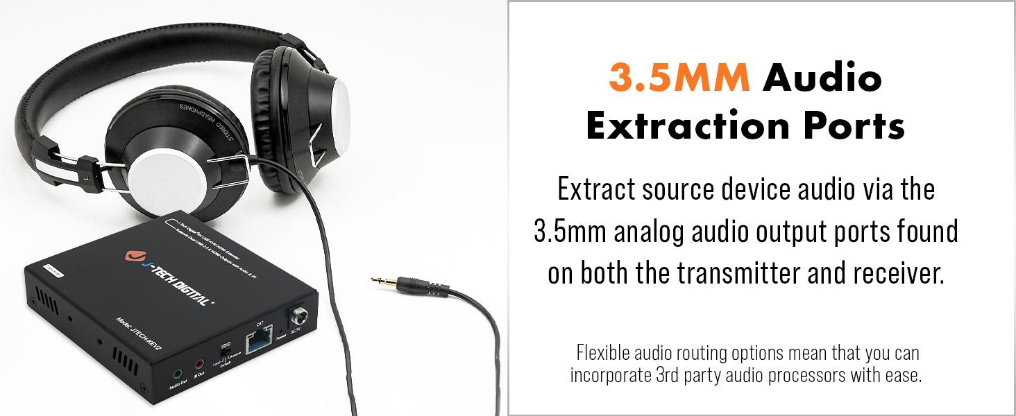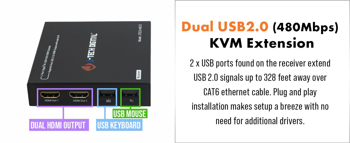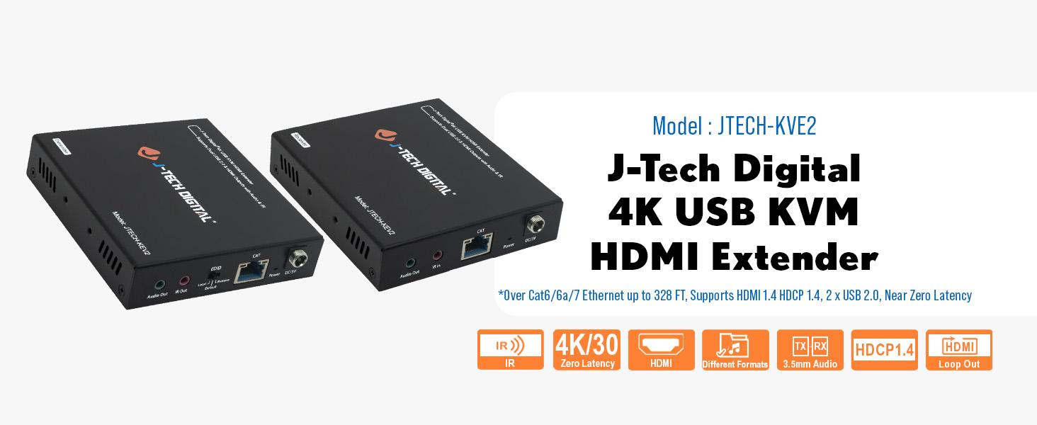 The J-Tech Digital JTECH-KVE2 HDMI & USB 2.0 KVM extender allows users to extend USB keyboard, mouse and HDMI signals up to 328 feet over CAT6 ethernet cable with near zero latency. This allows users to control a computer (or USB device) remotely up to 300+ feet away. Connect two remote HDMI displays to the receiver’s dual HDMI output ports and one local HDMI display to the transmitter’s local loop HDMI output port for flexible monitoring options. Extract source audio via the 3.5mm analog audio output ports found on both the transmitter and receiver so that users can route audio to a 3rd party audio processor/amplifier.
