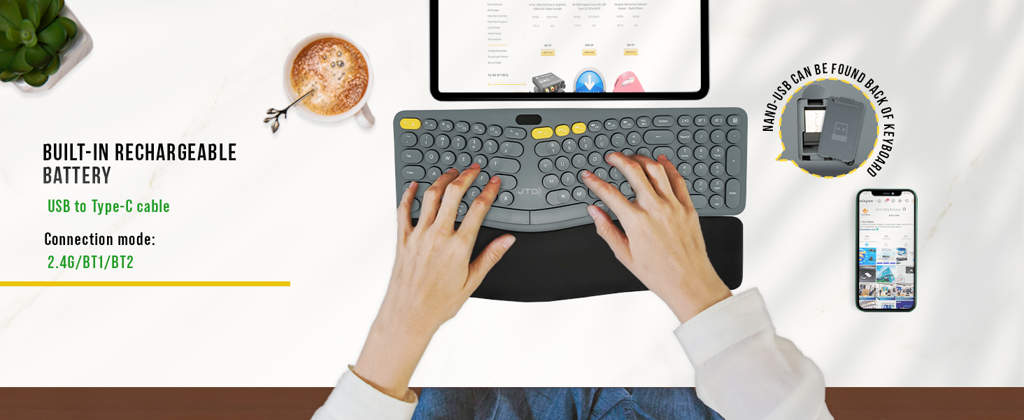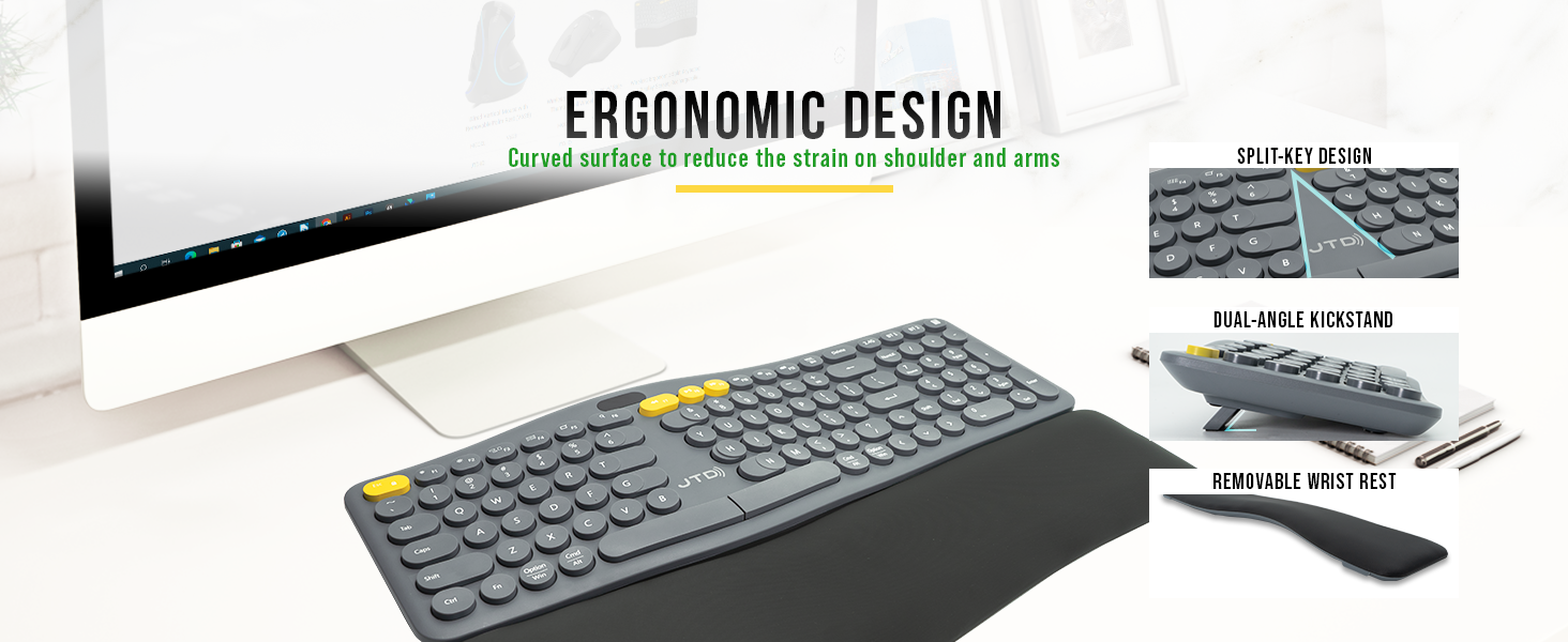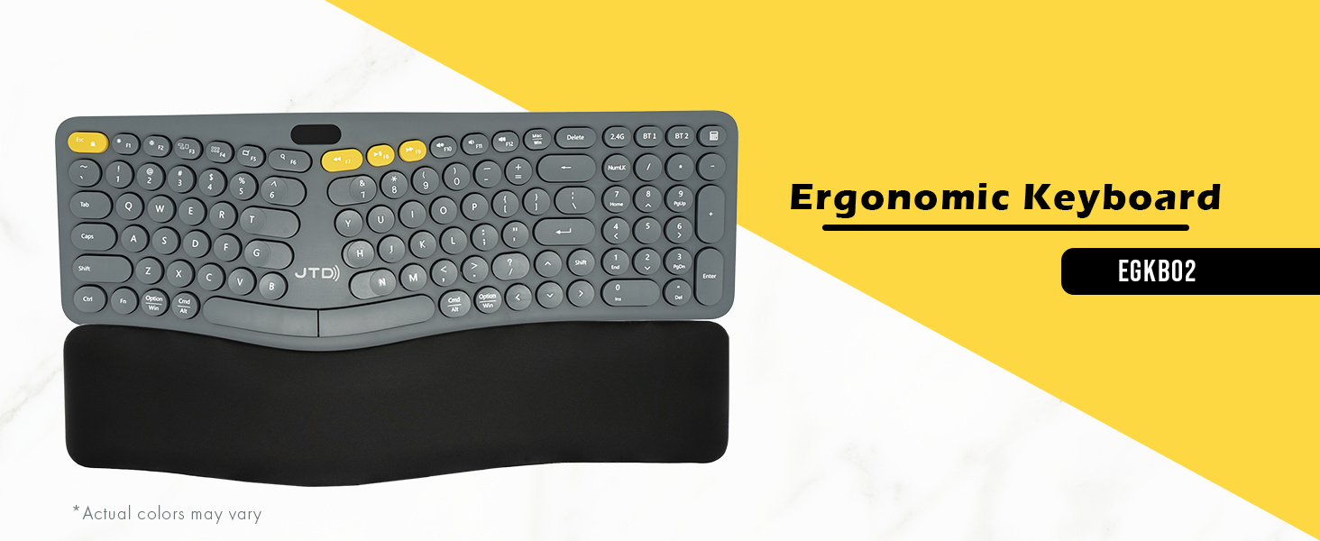 The J-Tech Digital EGKB02 Wireless Ergonomic Split Keyboard is a full sized, modern design, and extremely comfortable keyboard built for users looking to minimize their wrist and forearm discomfort without sacrificing typing precision. The curved design helps keep your wrists, forearms, and shoulders in a relaxed posture offering maximum comfort, and allows you to use the keyboard for continuous hours without strain or discomfort. The included removable wrist rest support provides additional support for your wrists and forearms.