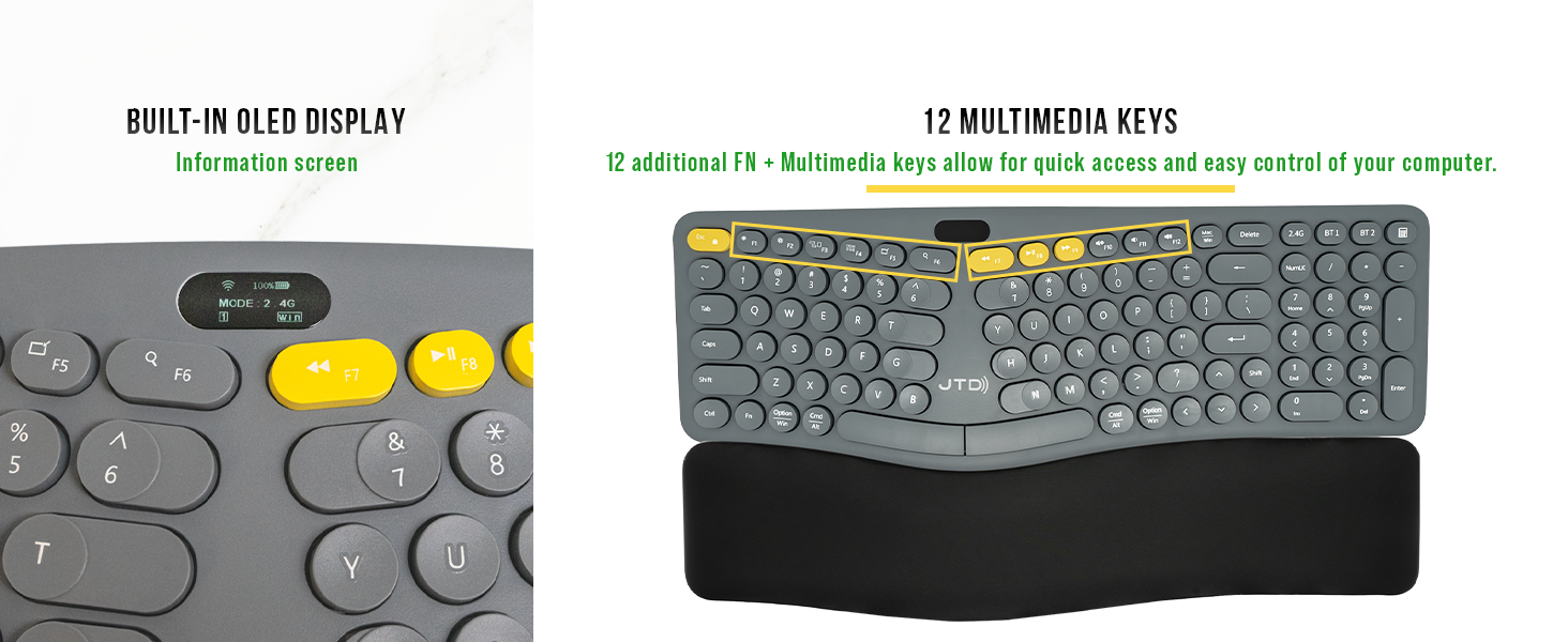 The EGKB02 keyboard can be connected to your devices via 2.4G wireless, Bluetooth 1 and/or Bluetooth 2 simultaneously. Offering wide compatibility with devices, you can now be flexible about using the keyboard with your favorite devices! The built-in rechargeable battery can last up to a month of continuous use eliminating the need for buying batteries. 12 FN+Multimedia keys offer additional control of your computer with ease.
