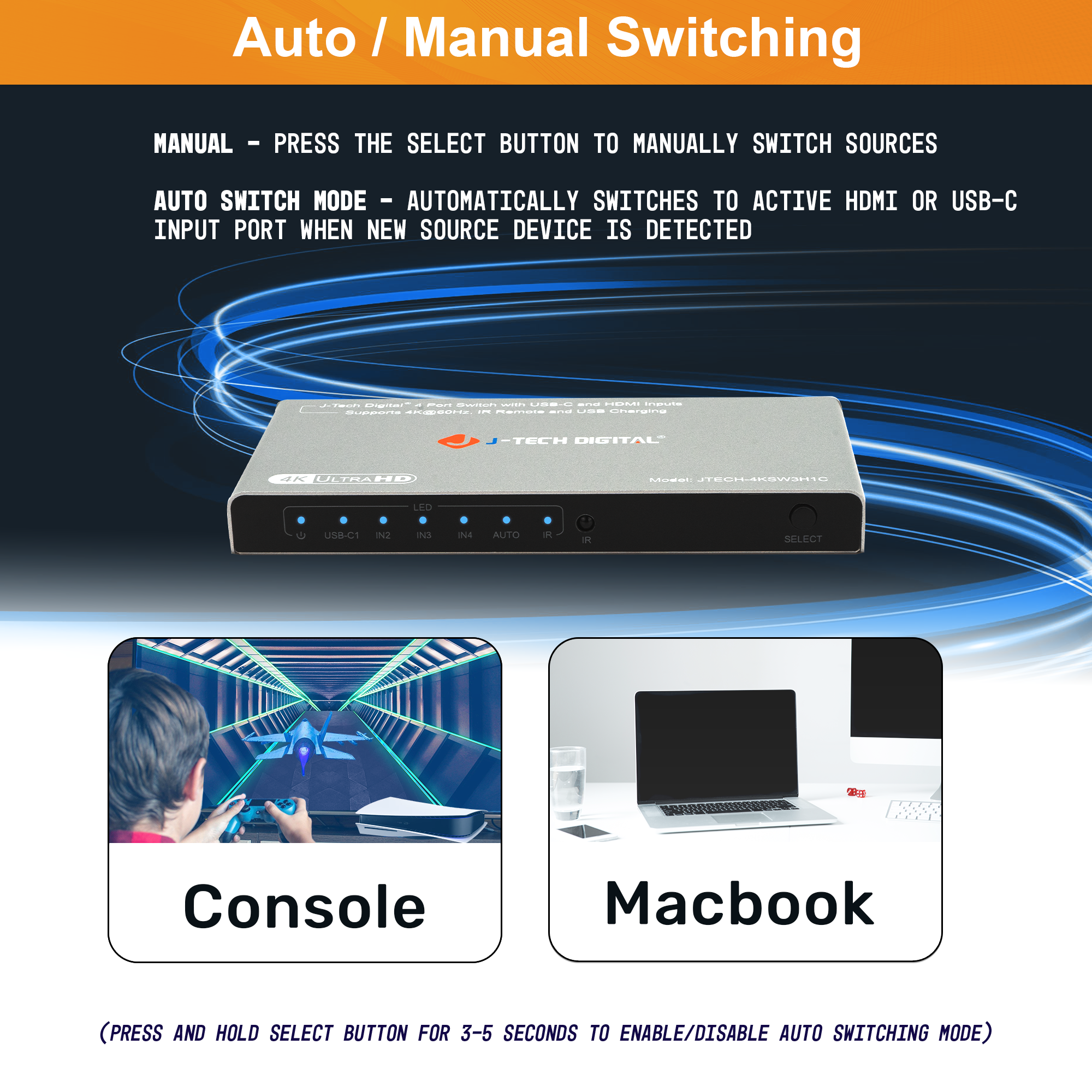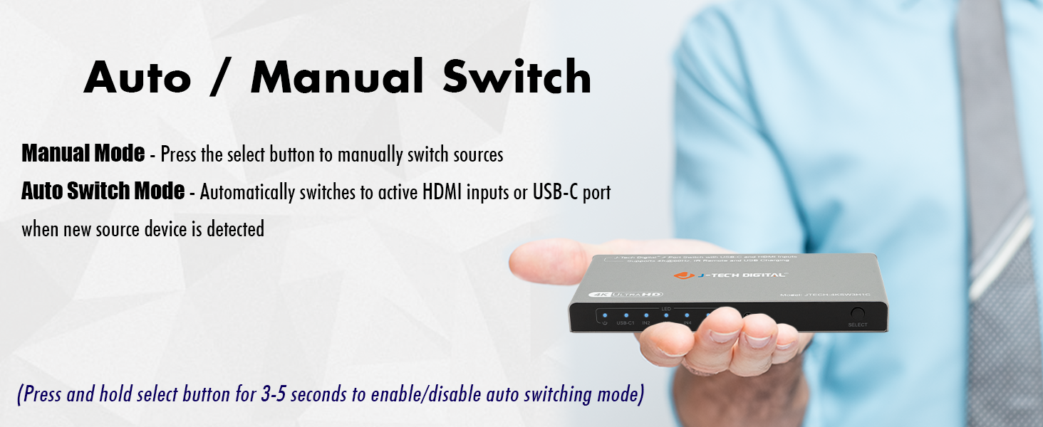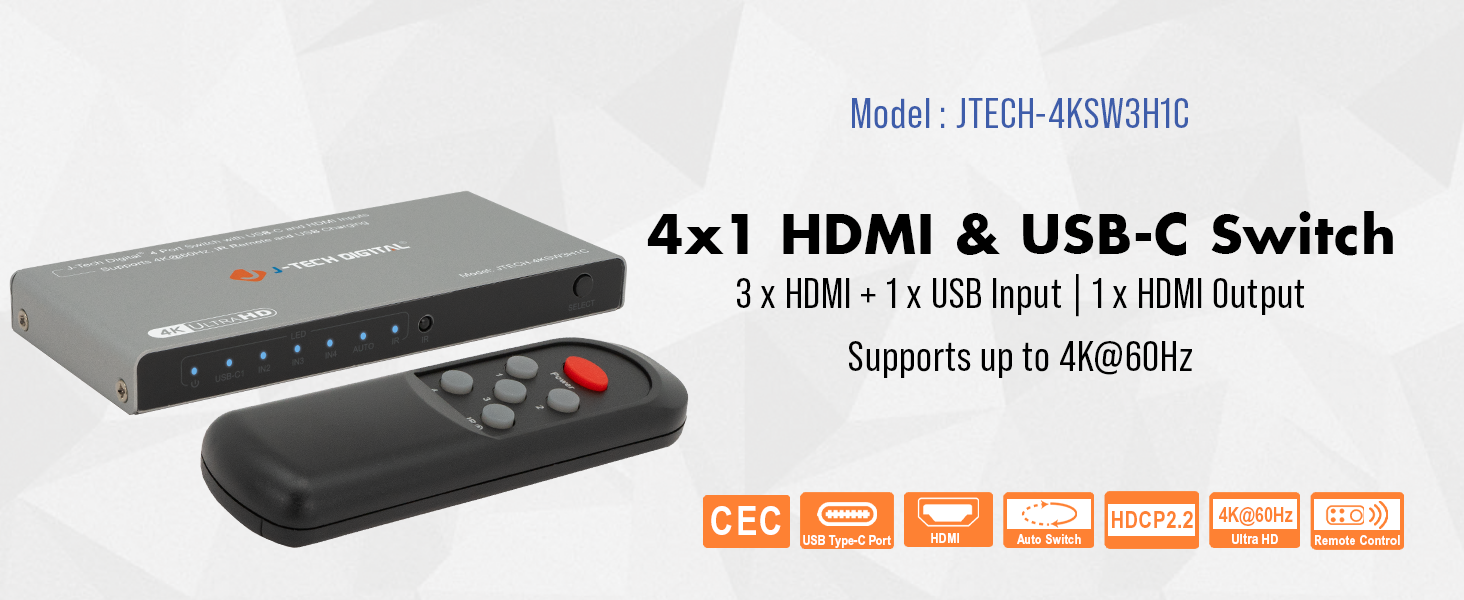 The JTECH-4KSW3H1C is a 4x1 switch that features 3 x HDMI inputs & 1 x USB-C input that can be connected to a single display. It supports resolutions up to 4K 60Hz 4:4:4, so that you can enjoy your content in vivid details. The dual switching modes provides you with the ability to either automatically or manually switch between your connected input source devices. Don’t let your setup become limited because of the available number of HDMI ports on your display. The JTECH-4KSW3H1C provides you with extra ports so that you can connect all of your favorite devices to your existing display and easily toggle through them to use the one you would like! Support for HDR/Dolby Vision and digital audio formats is also available. Install this unit in your setup today and feel the ease of use without any compromise.