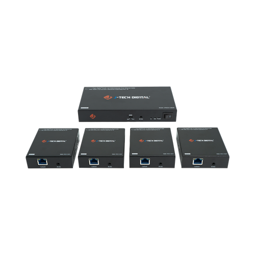 The JTECH-14EXP is an HDMI extender and splitter that efficiently extends a 1080P 60Hz HDMI A/V signal up to 164 feet using a single Cat5e/6 ethernet cable (per receiver). This system features 1 input and 4 outputs, complete with four receivers, and includes a local HDMI loop-out on the transmitter for connecting a fifth display to monitor the source. The Power Over Cable (PoC) function minimizes clutter by requiring only the transmitter to be connected to a power adapter, with the receivers drawing power through the ethernet cables.