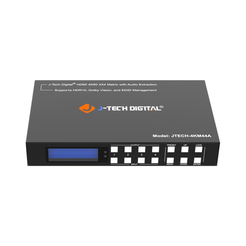 The J-Tech Digital JTECH-4KM44A is a professional UHD 4K@60Hz 4:4:4 HDR HDMI video distribution matrix switcher. With 18Gbps HDMI 2.0 support, the JTECH-M4KM44A 4×4 HDMI Matrix allows up to four UHD 4K sources to be independently routed to four UHD displays. All four outputs support audio de-embedding via coaxial S/PDIF or analog phoenix connectors. Pair the audio de-embedding function with the JTECH-4KM44A‘s EDID management tool (built in EDID + EDID copy) and you have an incredibly versatile and flexible HDMI routing system suitable for a number of applications.
