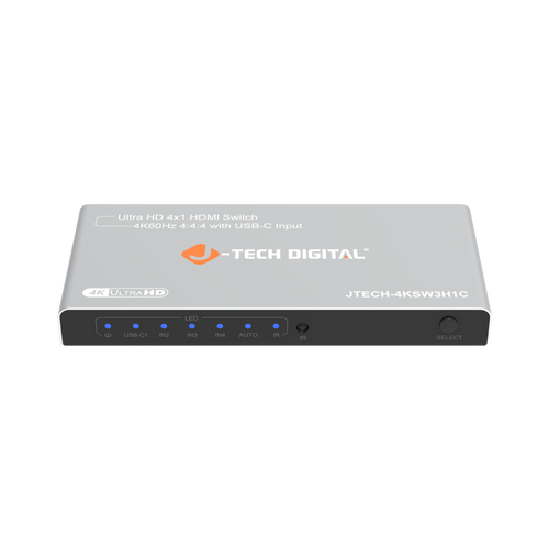 The JTECH-4KSW3H1C is a 4x1 switch that features 3 x HDMI inputs & 1 x USB-C input that can be connected to a single display. It supports resolutions up to 4K 60Hz 4:4:4, so that you can enjoy your content in vivid details. The dual switching modes provides you with the ability to either automatically or manually switch between your connected input source devices. Don’t let your setup become limited because of the available number of HDMI ports on your display. The JTECH-4KSW3H1C provides you with extra ports so that you can connect all of your favorite devices to your existing display and easily toggle through them to use the one you would like! Support for HDR/Dolby Vision and digital audio formats is also available. Install this unit in your setup today and feel the ease of use without any compromise.