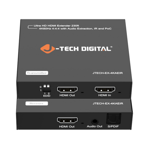 Take your home entertainment or workspace setup to the next level with this powerful and easy-to-use J-Tech Digital 4K@60Hz HDMI extender. Transmit crystal-clear 4K@60Hz 4:4:4 UHD video and high-quality audio up to 230ft or 295ft for 4K@30Hz/1080p, all over a single Cat5e/6 Ethernet cable. This 4K HDMI extender is packed with features like HDR10, HDCP 2.2/1.4 compliance, 18Gbps bandwidth, HDMI loop-out for connecting a local display, and dual POC (Power over Cable) meaning no extra power adapters needed.
