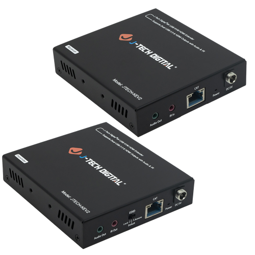 The J-Tech Digital JTECH-KVE2 HDMI & USB 2.0 KVM extender allows users to extend USB keyboard, mouse and HDMI signals up to 328 feet over CAT6 ethernet cable with near zero latency. This allows users to control a computer (or USB device) remotely up to 300+ feet away. Connect two remote HDMI displays to the receiver’s dual HDMI output ports and one local HDMI display to the transmitter’s local loop HDMI output port for flexible monitoring options. Extract source audio via the 3.5mm analog audio output ports found on both the transmitter and receiver so that users can route audio to a 3rd party audio processor/amplifier.