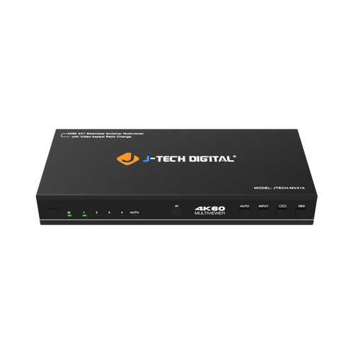The JTECH-MV41A is a 4 input 1 output multi-viewer & seamless switcher. Users can now enjoy 4 different source devices on a single display in 4K resolution at 60Hz with no data-delay. Supporting 8 different display modes, users can fit and rearrange their HDMI sources as desired. Video aspect ratio changing ability allows users to eliminate any stretched out or out-of-frame images, while JTECH-MV41A’s audio extraction feature allows users to send audio to their external sound systems. The JTECH-MV41A is perfect for any residential or commercial install, and a great companion for audio/video distribution.
