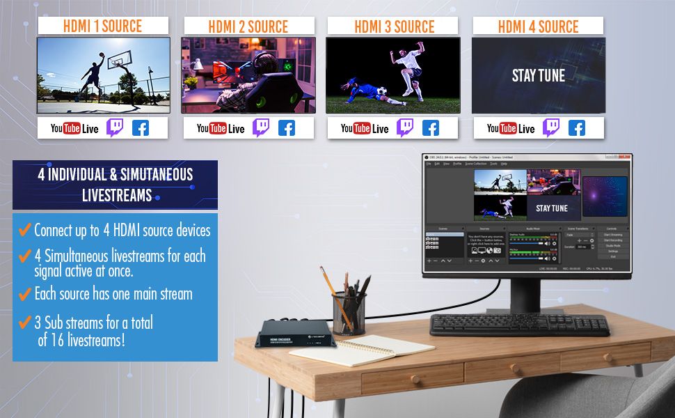 With 4 HDMI inputs, this encoder supports either 2× 4K@30Hz or 4× 1080P sources, allowing you to connect cameras, laptops, or media players for multi-angle or multi-source streaming. Stream up to 4 individual and simultaneous livestreams—each with one main and three substreams, for a total of 16 active streams.
