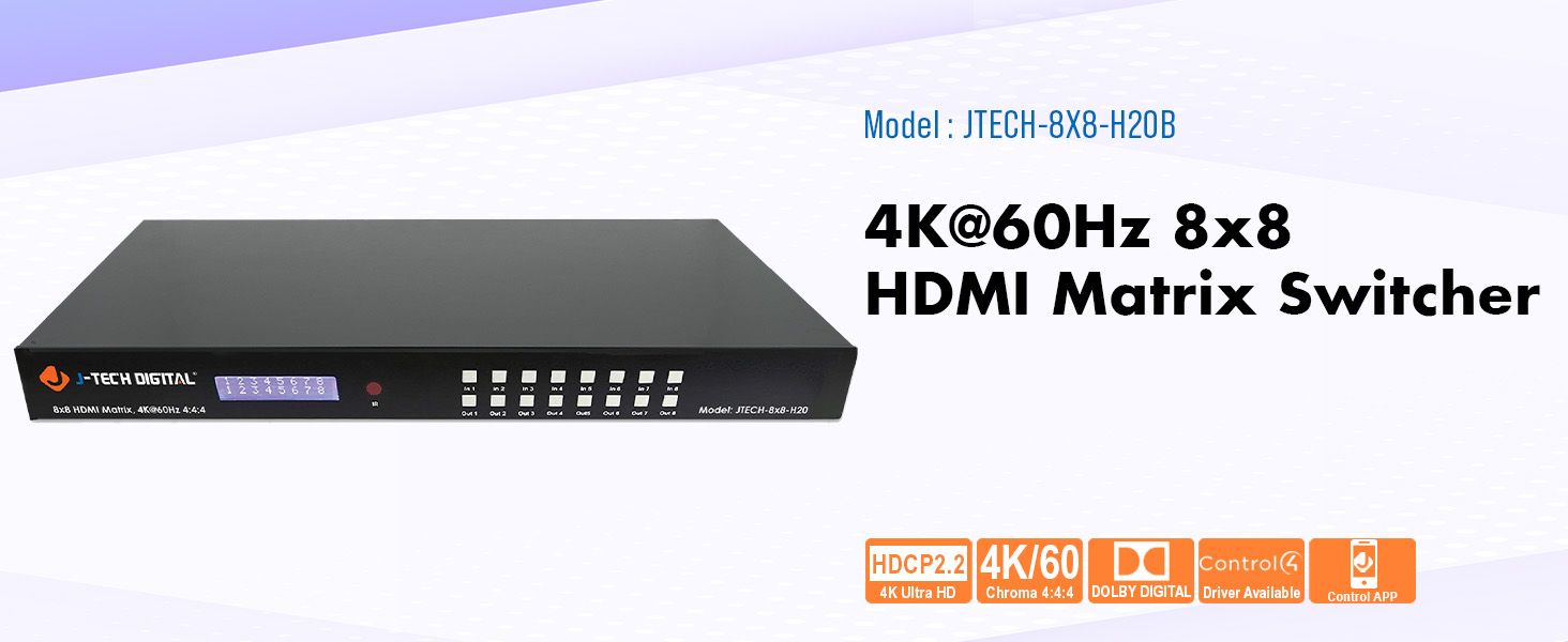 JTECH-8X8-H20 HDMI Matrix Switch – 8x8 4K@60Hz HDMI 2.0 Matrix with SPDIF, RS232, IR & Ethernet Control