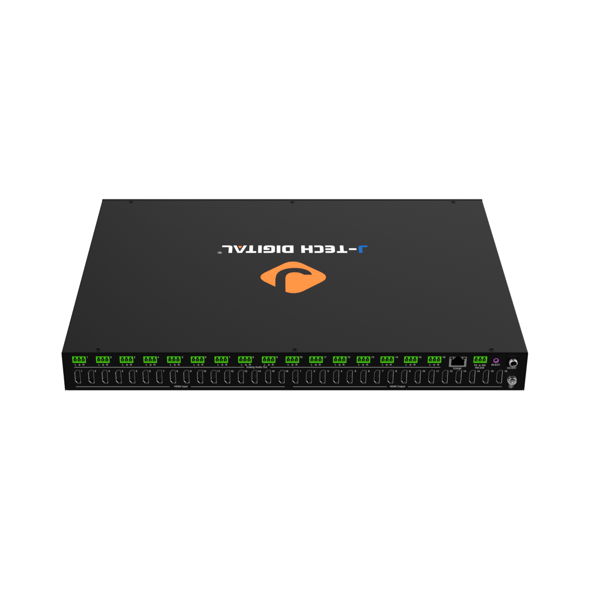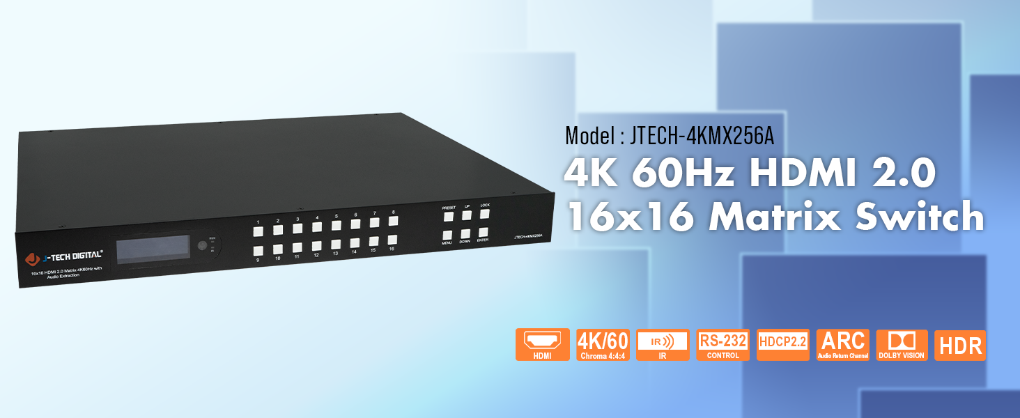 The JTECH-4KMX256A is a versatile 16x16 4K 60Hz HDMI matrix designed to connect up to 16 HDMI sources and distribute their signals to 16 separate displays. It supports both one-to-many and many-to-many routing configurations, making it an ideal audio/video distribution solution for both commercial and residential setups. Additionally, the matrix includes 16 analog audio ports for creating an audio matrix. Enjoy content with full detail thanks to support for HDR, HDR10, and Dolby Vision. The unit can be easily controlled through various methods for your convenience. Smart EDID management ensures broad compatibility, while the 4K to 1080P downscaling feature allows you to mix and match displays without concerns about upgrading your equipment.