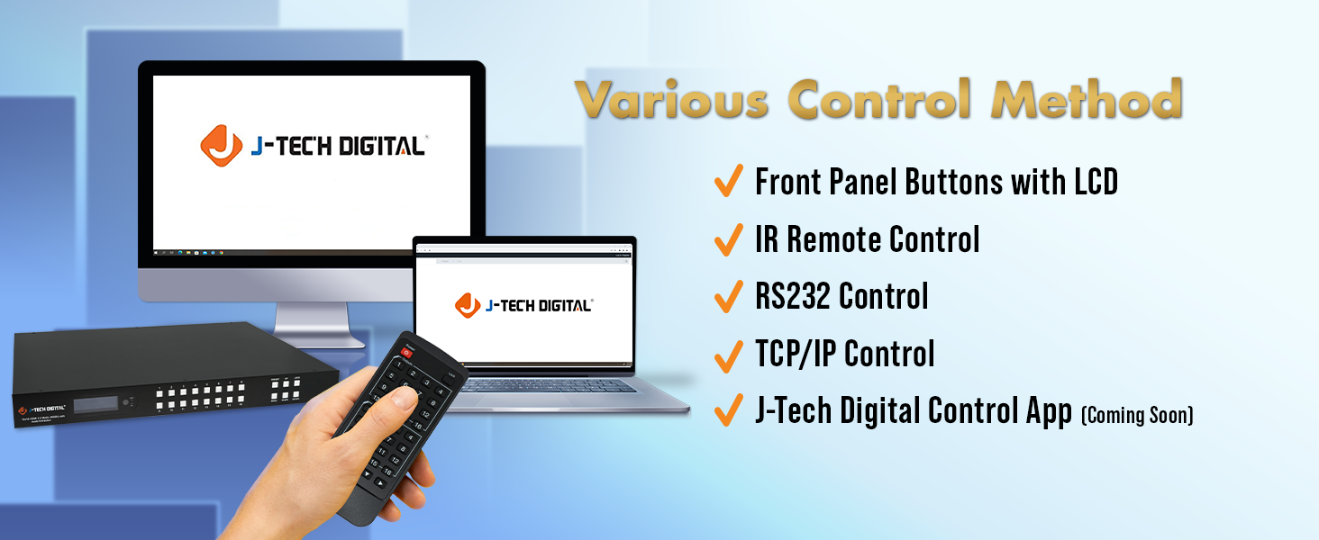 ✅ Control via front panel buttons, IR remote, RS232, web-based interface | Toggle individual video/audio signals on/off via the front LCD screen or web interface