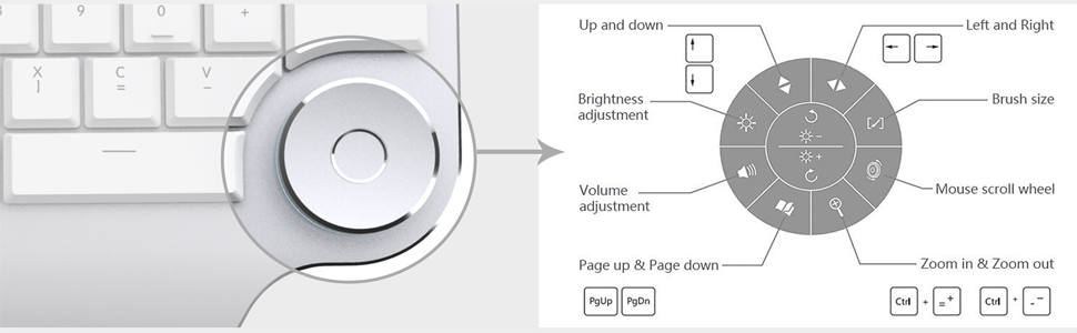 The multi-functional dial gives you full control with intuitive actions like zoom in/out, scroll, rotate, page up/down, volume, and brightness adjustment—perfect for precision editing and smooth workflow navigation.
