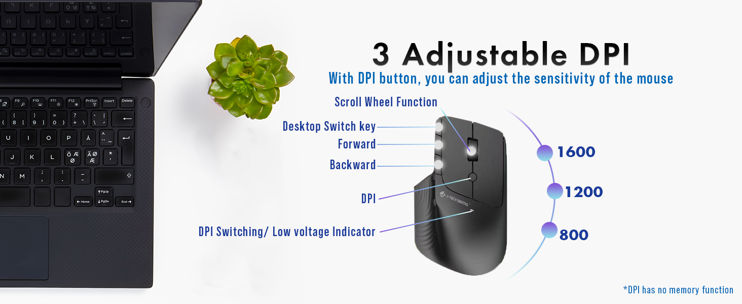 ✅ 3 levels of adjustable DPI (800/1200/1600)