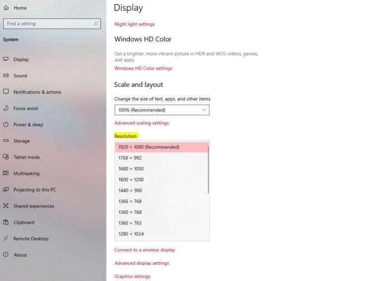 - In the Display menu, scroll down to the locate the Resolution header, and click on the drop-down menu to view the list of available resolutions. Click on the desired resolution to make the changes.