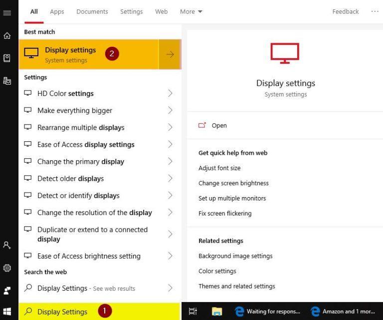 - In the Windows Search bar, type in Display Settings, and click on the highlighted Display Settings option.