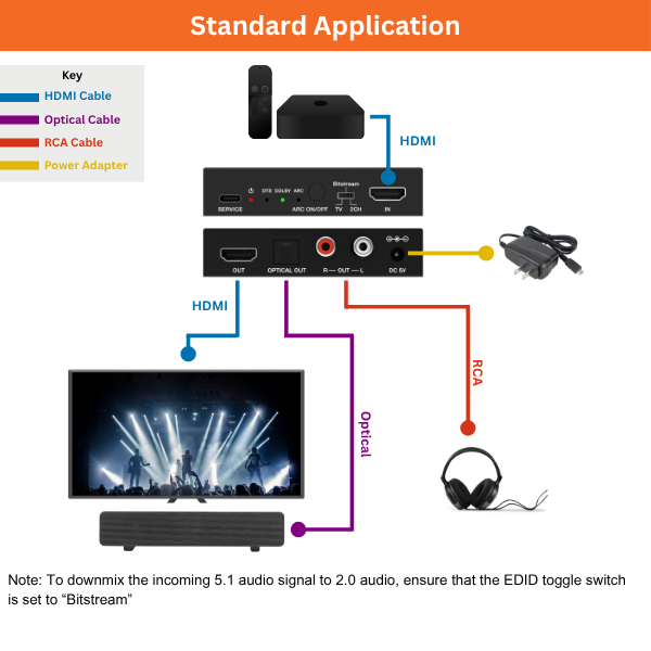 - To downmix 5.1Ch audio to 2Ch audio, ensure that the EDID toggle switch is set to "Bitstream". This will allow audio output via both Optical and RCA simultaneously; Optical will output 5Ch, while RCA will output 2Ch