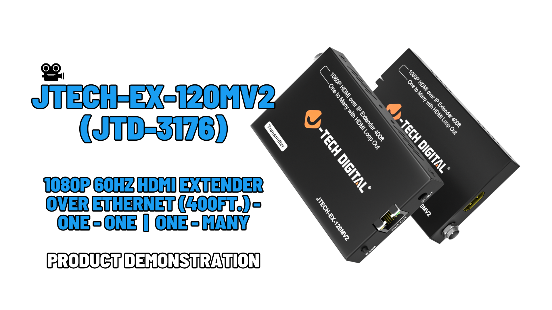 Introducing the JTECH-EX-120MV2 by J-Tech Digital; 1080P 60Hz HDMI extender over single ethernet Cat5e/6/7 cable. Extend Full HD 1080p video up to 400ft (120m) or 720p HD video up to 660ft (200m) with zero latency and crystal-clear quality. This one-to-many HDMI extender allows you to distribute one HDMI source to multiple displays over a LAN network. Featuring an HDMI loop-out on the transmitter, it enables local monitoring while extending the HDMI signal for real-time surveillance, gaming setups, and control rooms. Supporting 480p, 720p, 1080i, and 1080p resolutions with 4.95Gbps high-speed bandwidth and TCP/IP protocol compatibility, this HDMI over Cat6 extender ensures seamless, lag-free video transmission for professional and commercial AV applications.