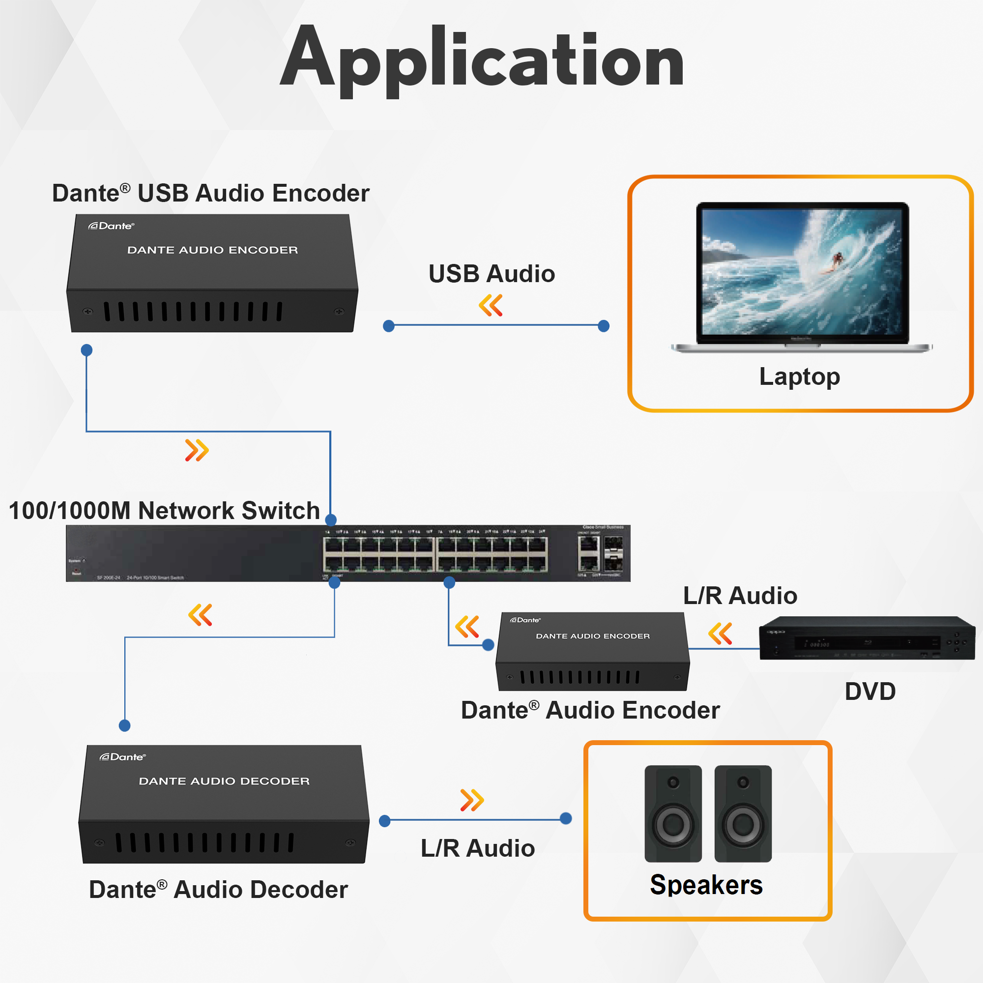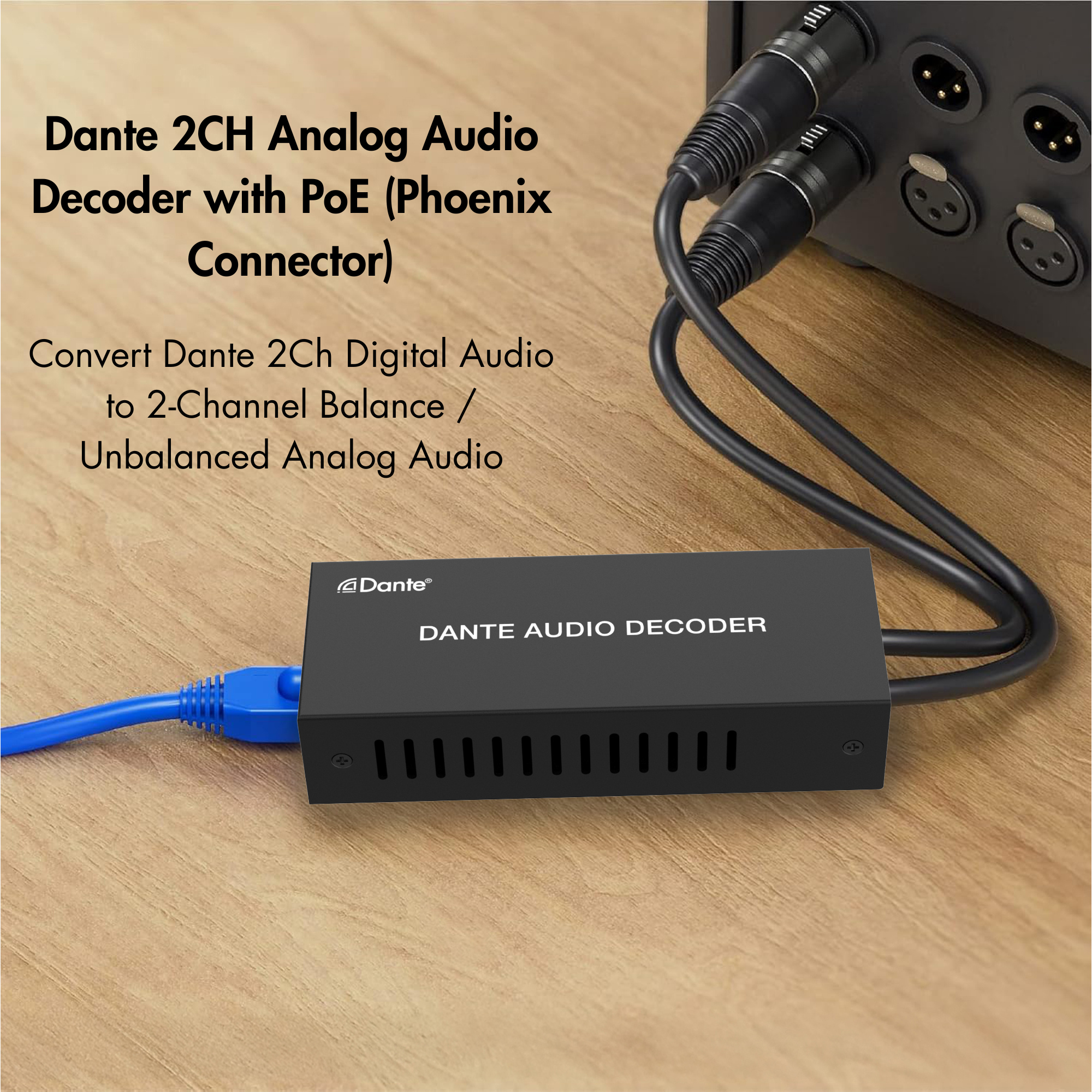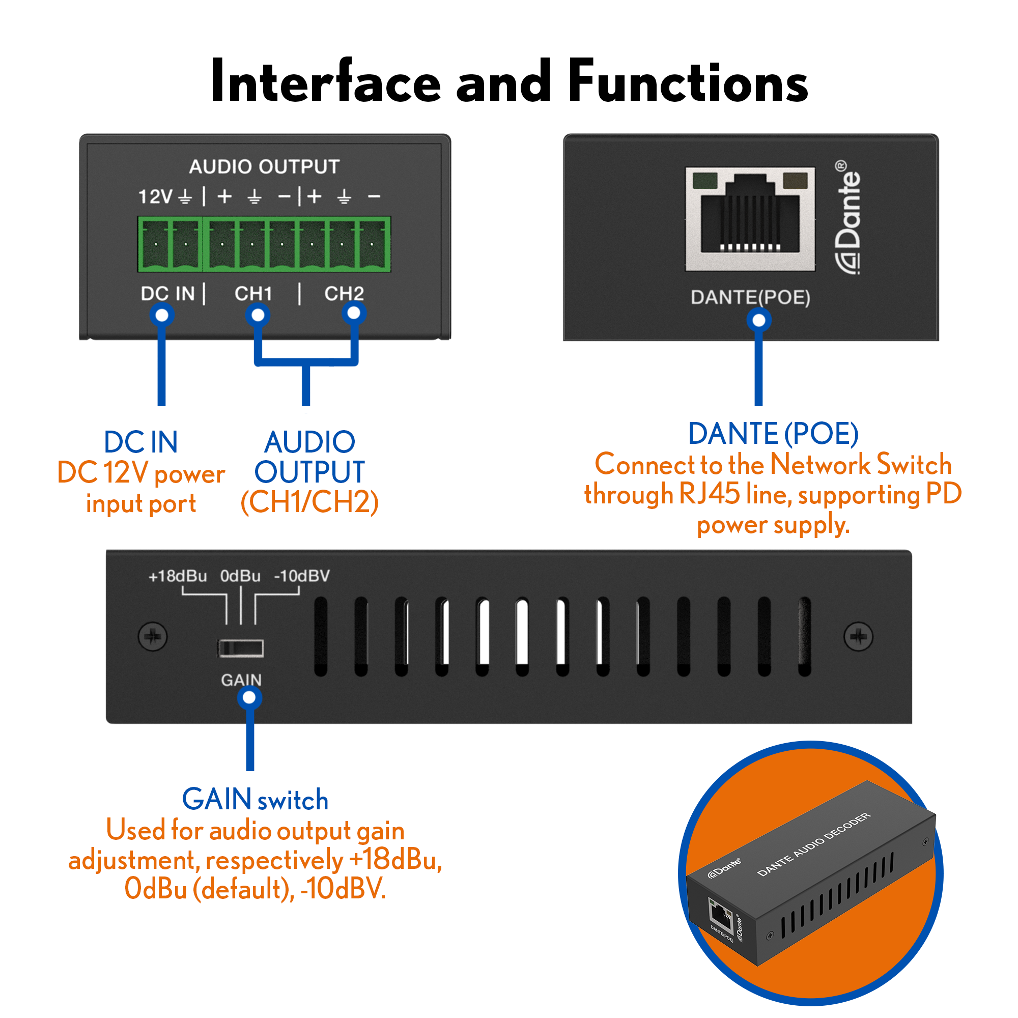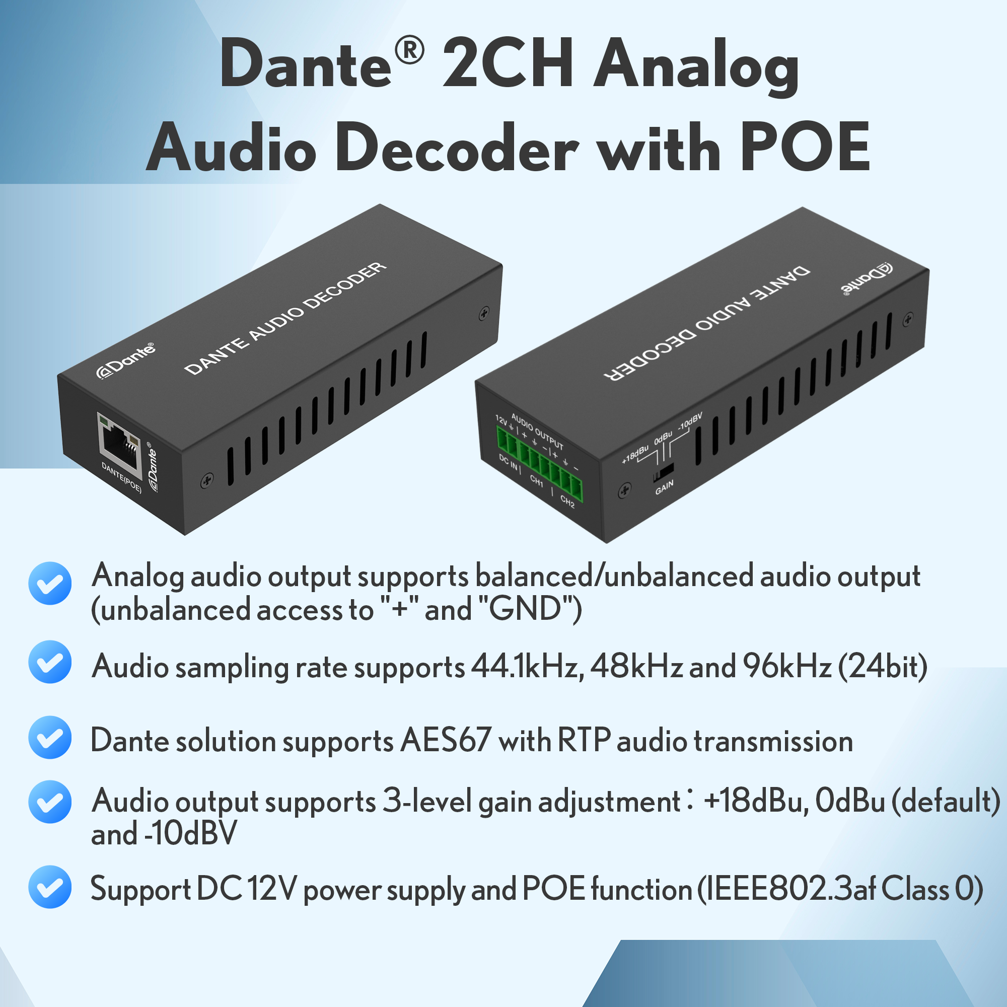 ✅ Dante 2CH Audio Decoding: Receives and decodes network audio using Dante Ultimo technology, outputting crystal-clear analog sound.