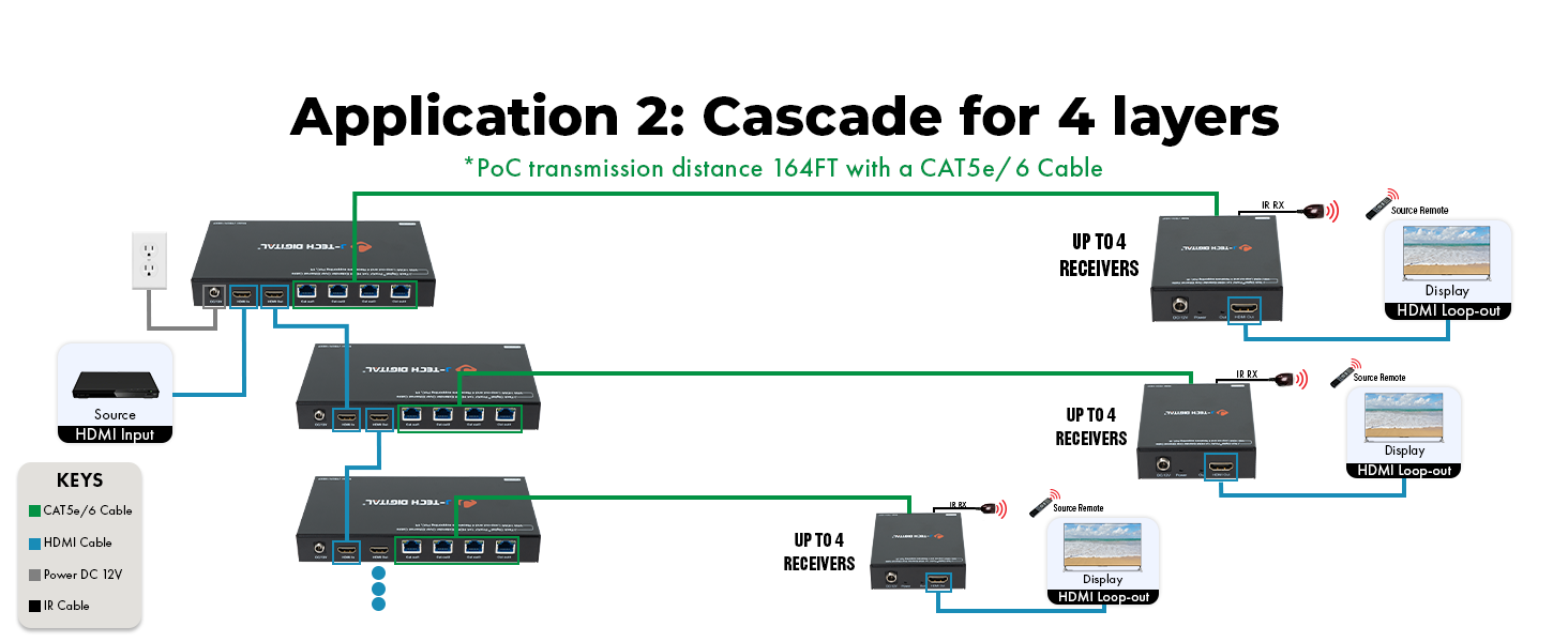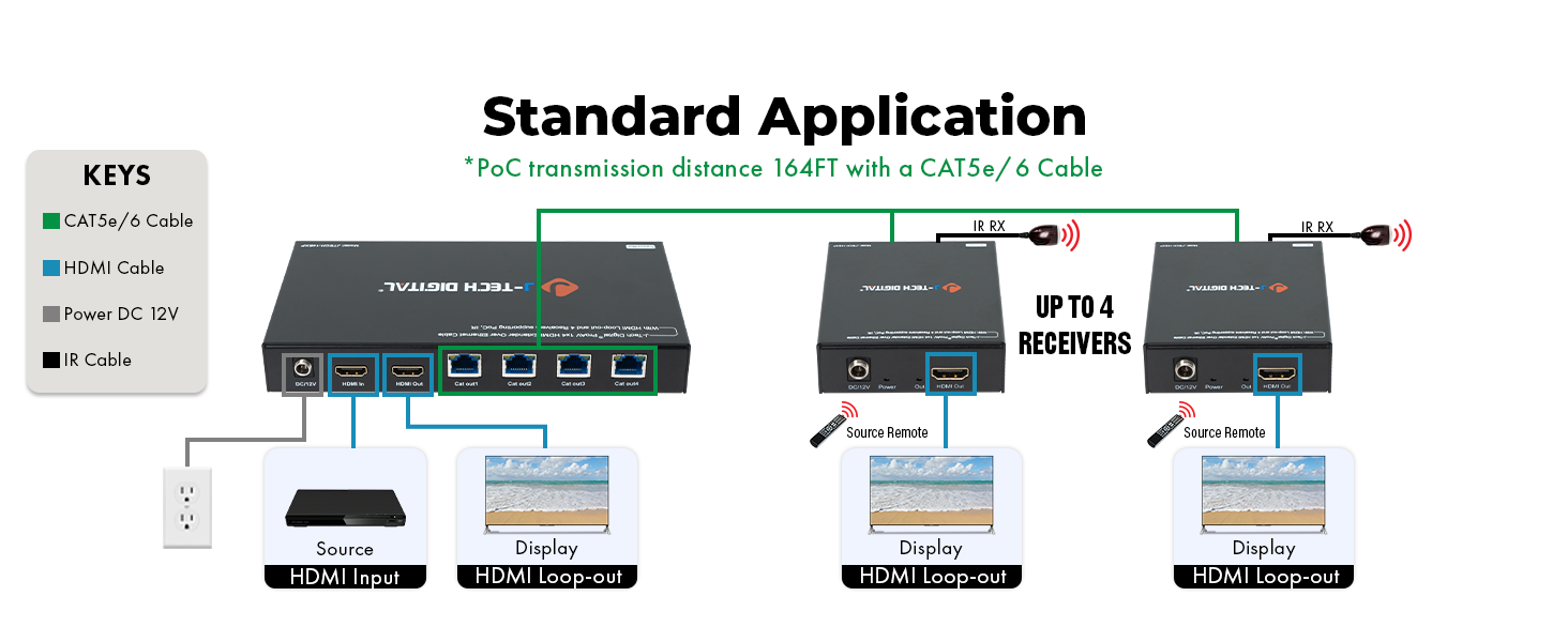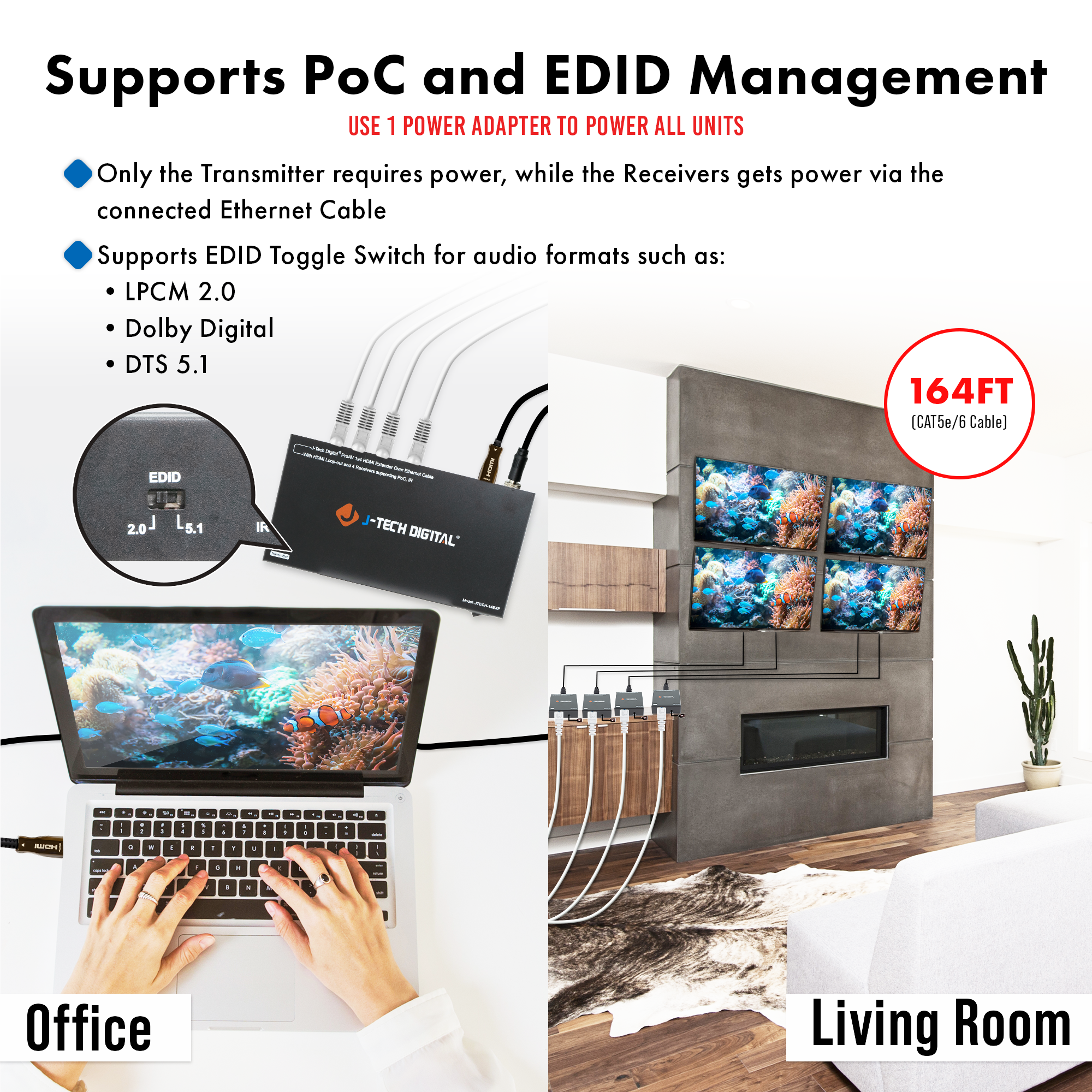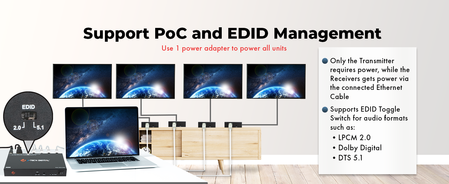 ✅ Power Over Cable (PoC) Functionality: Only the transmitter requires a power adapter; receivers are powered through the ethernet connection