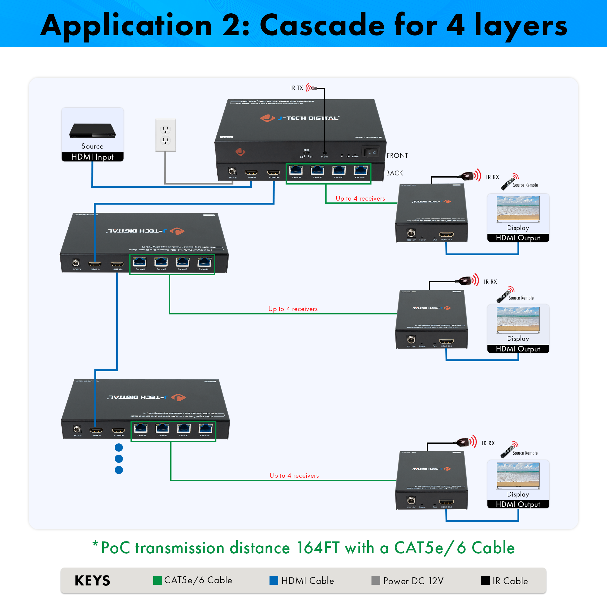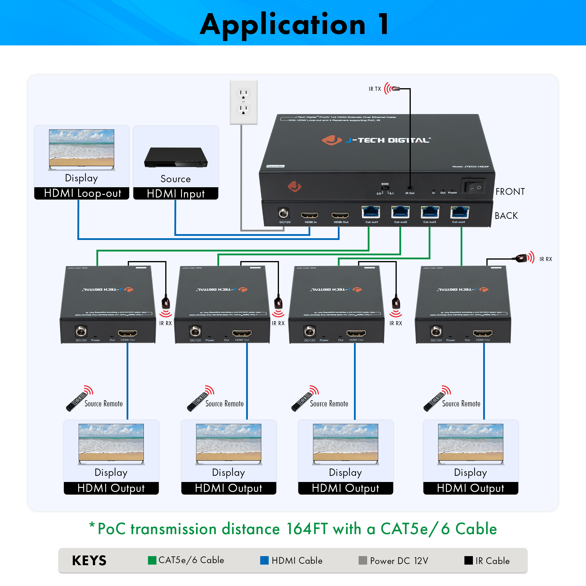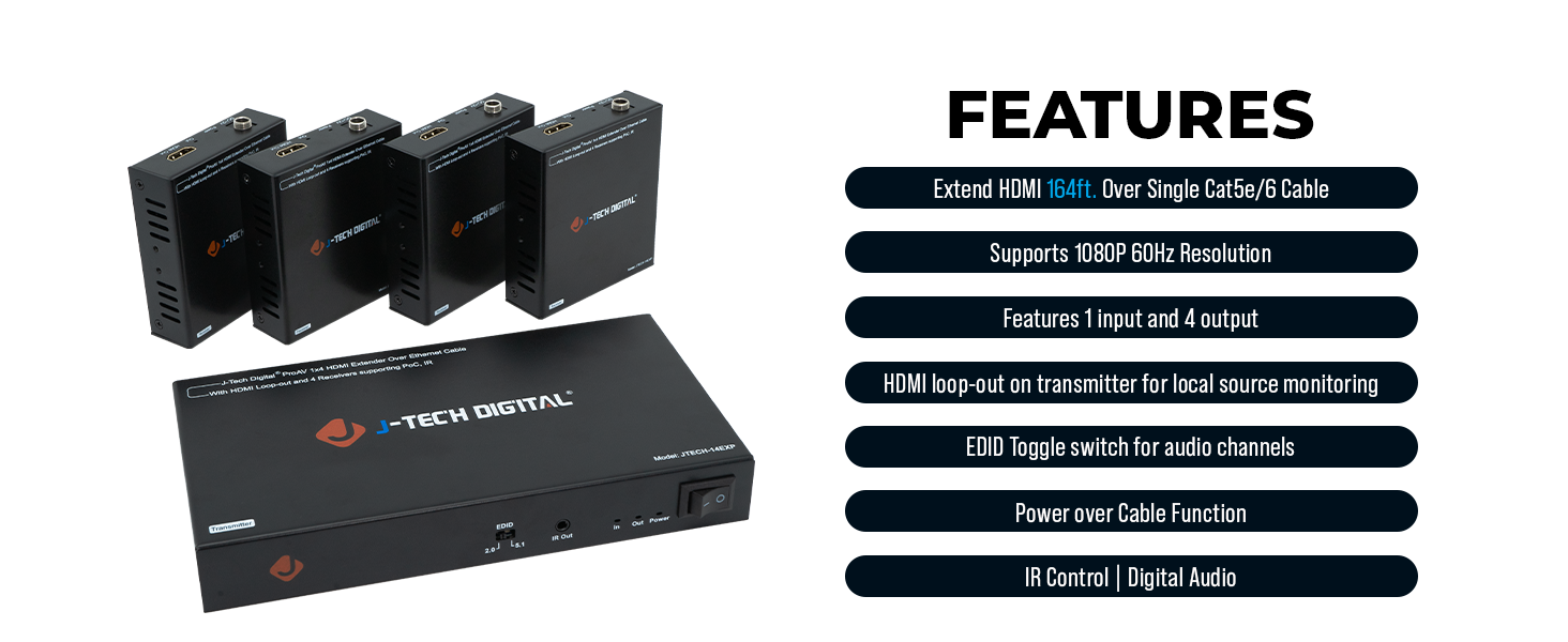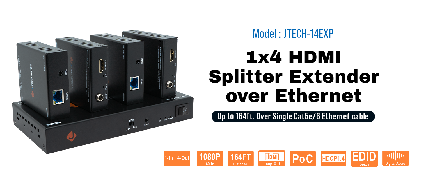 The JTECH-14EXP is an HDMI extender and splitter that efficiently extends a 1080P 60Hz HDMI A/V signal up to 164 feet using a single Cat5e/6 ethernet cable (per receiver). This system features 1 input and 4 outputs, complete with four receivers, and includes a local HDMI loop-out on the transmitter for connecting a fifth display to monitor the source. The Power Over Cable (PoC) function minimizes clutter by requiring only the transmitter to be connected to a power adapter, with the receivers drawing power through the ethernet cables.