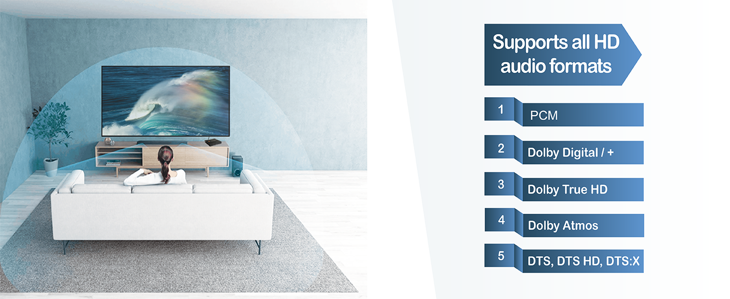 ✅ Supports HD Audio Formats: Supports all HD audio formats, including PCM, Dolby Digital, Dolby True HD, Dolby Atmos, DTS, DTS HD, DTS: X and Dolby Digital+