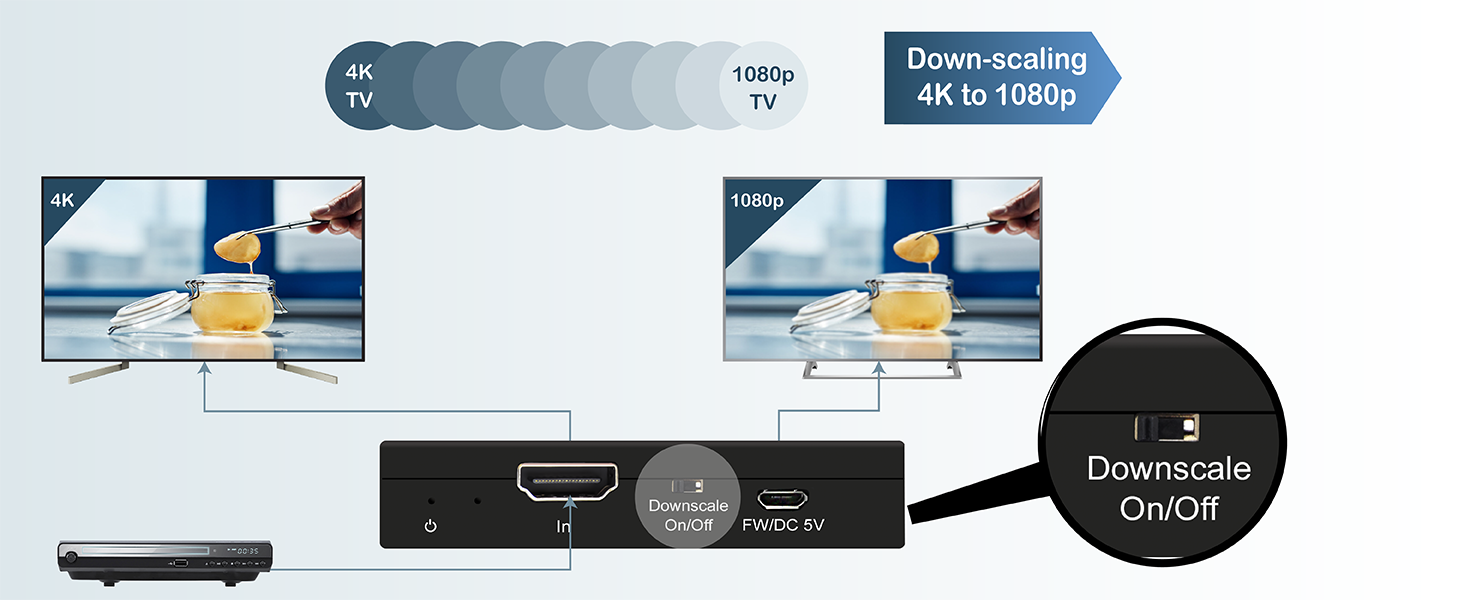 Note: If you’re sending a 4k signal to a 4k TV and a 1080p TV, the MRO will automatically downgrade and send a compatible HDMI signal to the 1080p TV