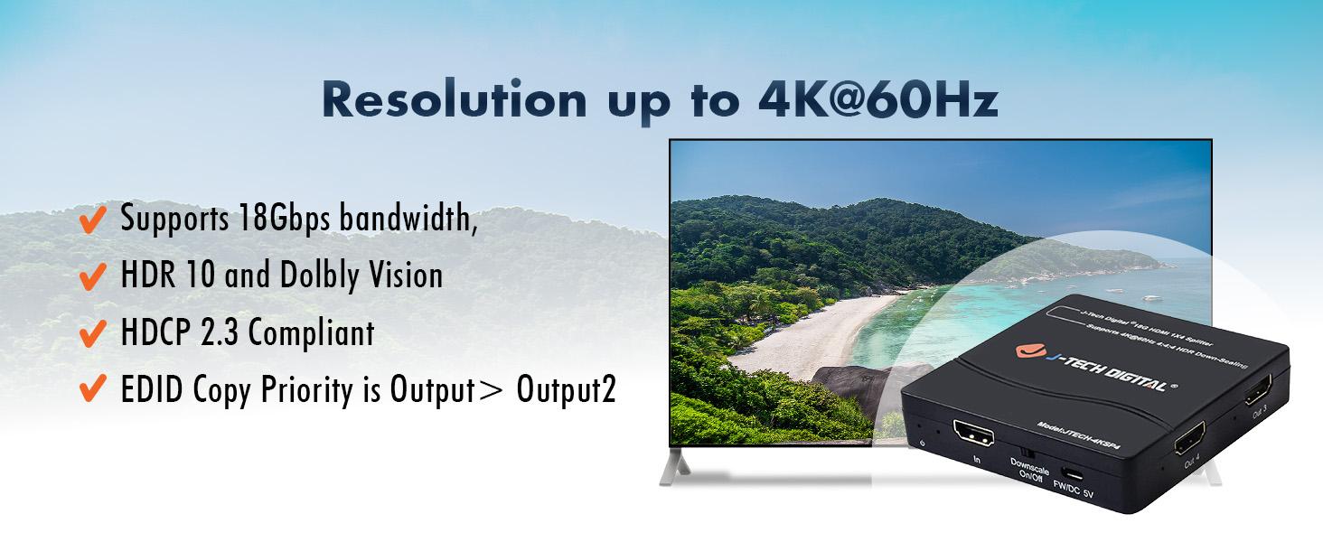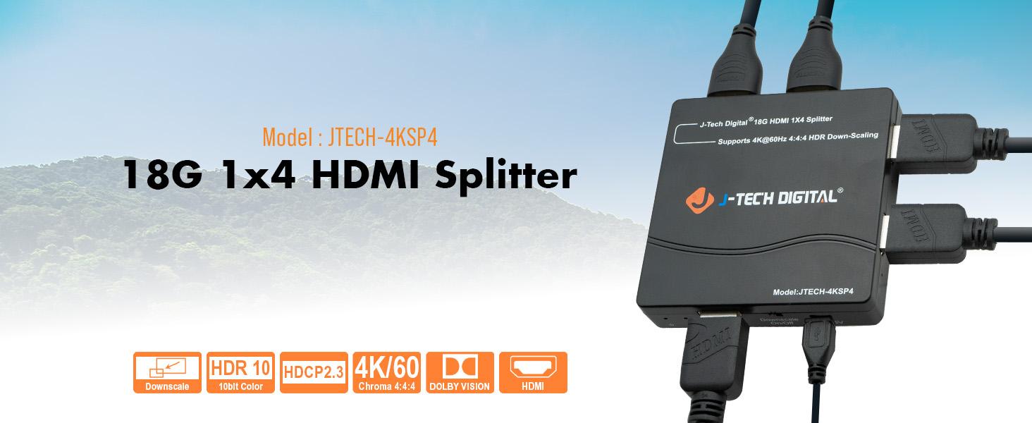 The JTECH-4KSP4 1 x 4 HDMI splitter is a Multi-Resolution Output HDMI scaler switcher that can support various UHD resolutions. This 1 x 4 HDMI splitter is perfect for users that are in the process of upgrading their entertainment centers and need a device that supports 4K and 1080p resolutions, allowing them to integrate newer, more advanced displays without having to replace their older model displays.