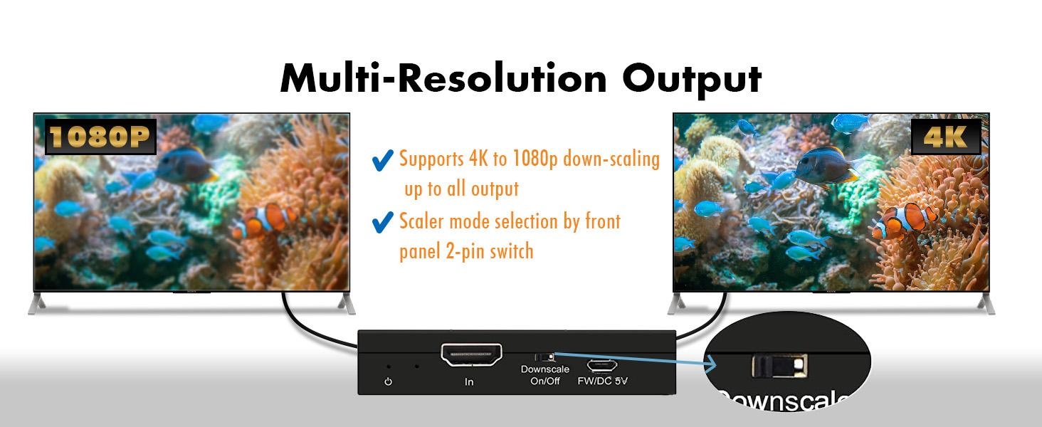 ✅ Front panel HDMI downscale function on/off switch | Power Supply: DC 5V/1A