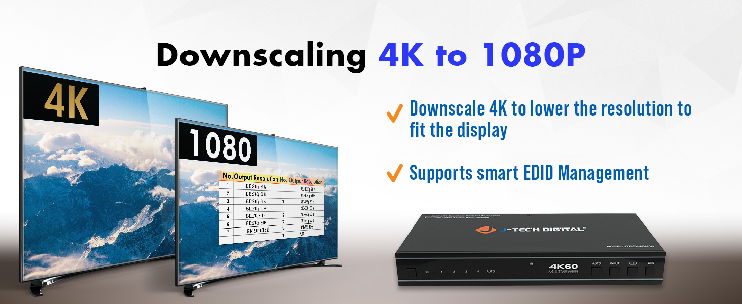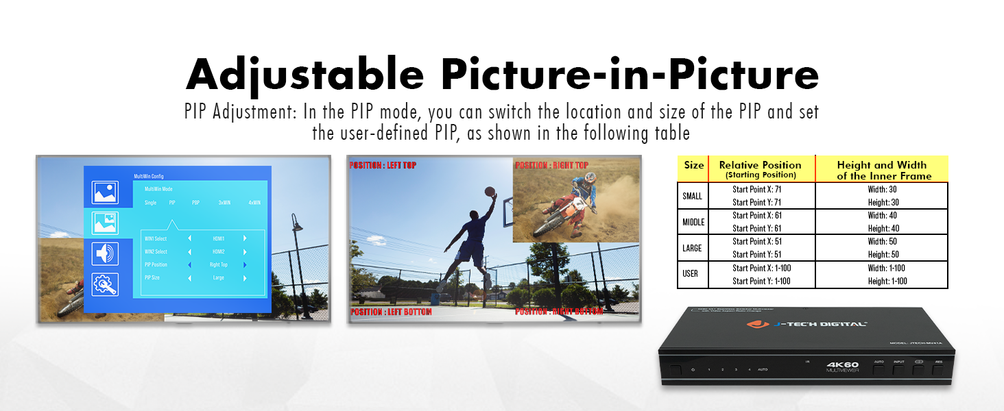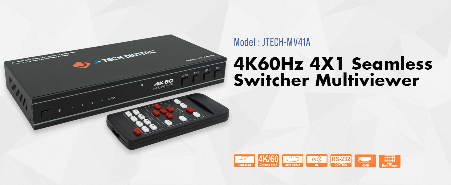 The JTECH-MV41A is a 4 input 1 output multi-viewer & seamless switcher. Users can now enjoy 4 different source devices on a single display in 4K resolution at 60Hz with no delay. Supporting 8 different display modes, users can fit and rearrange their HDMI sources as desired. Video aspect ratio changing ability allows users to eliminate any stretched out or out-of-frame images, while JTECH-MV41A’s audio extraction feature allows users to send audio to their external sound systems. The JTECH-MV41A is perfect for any residential or commercial install, and a great companion for audio/video distribution.