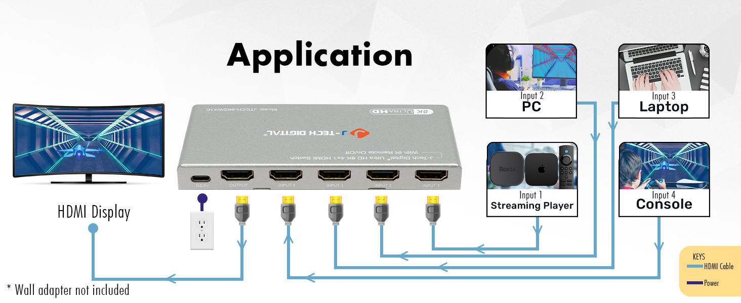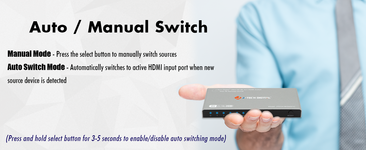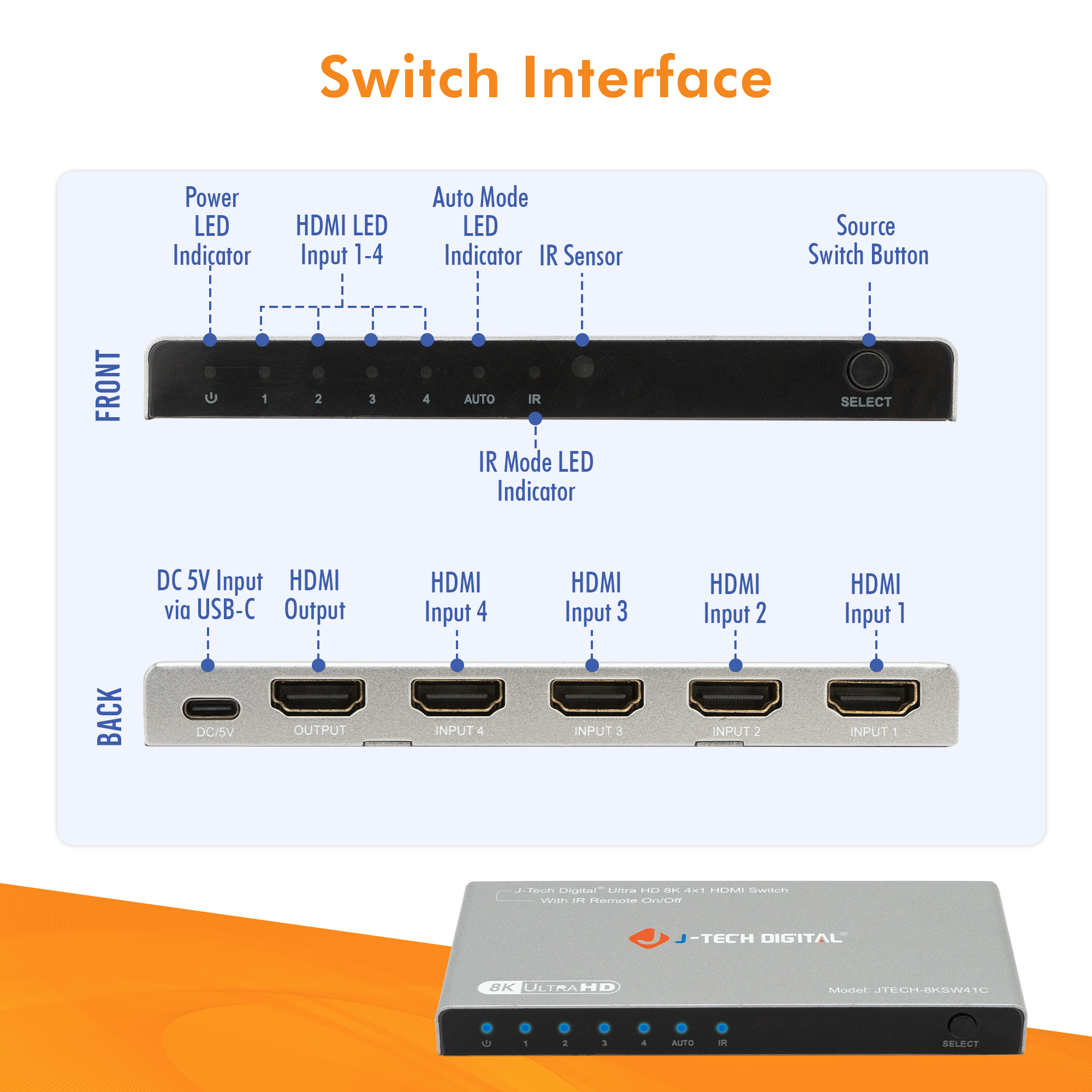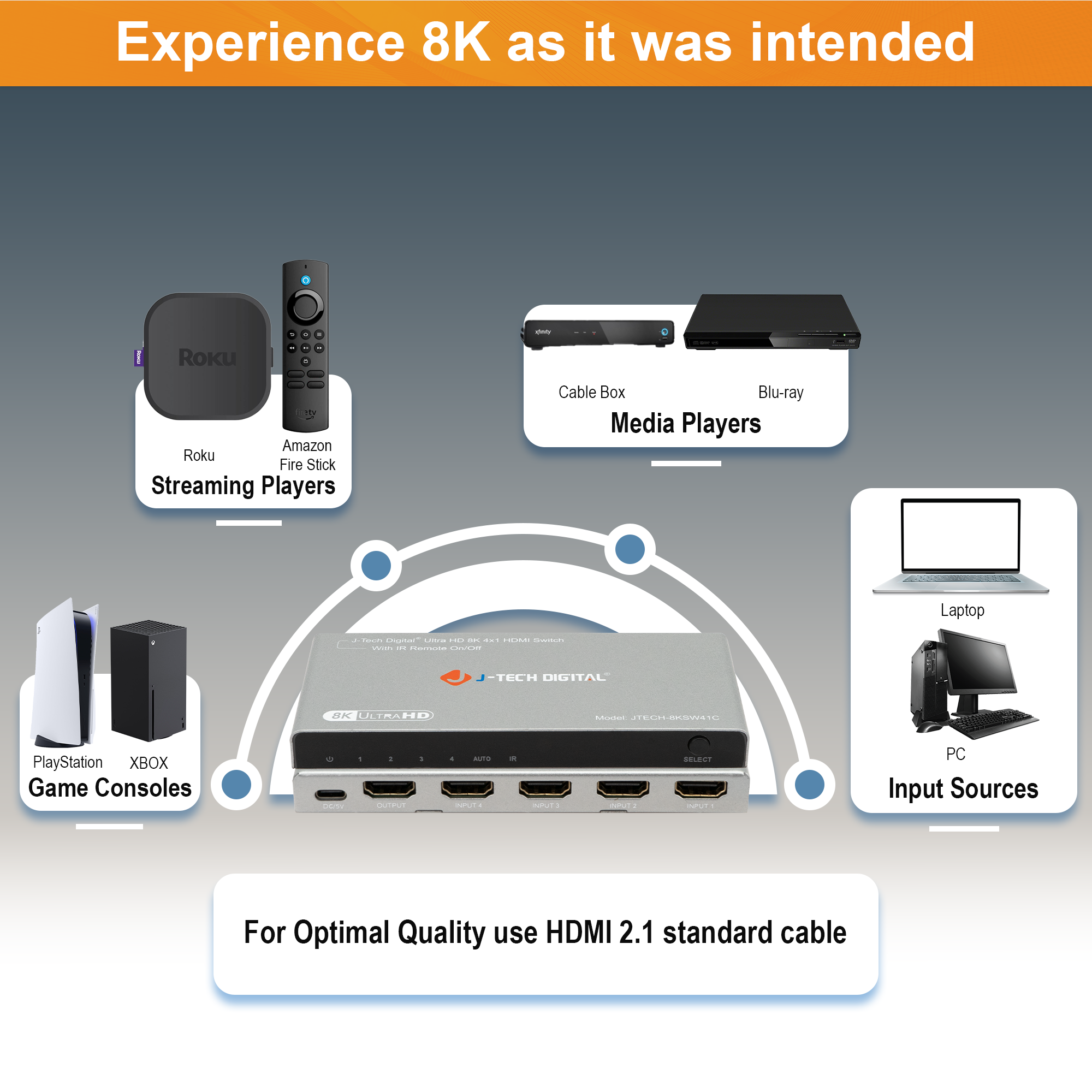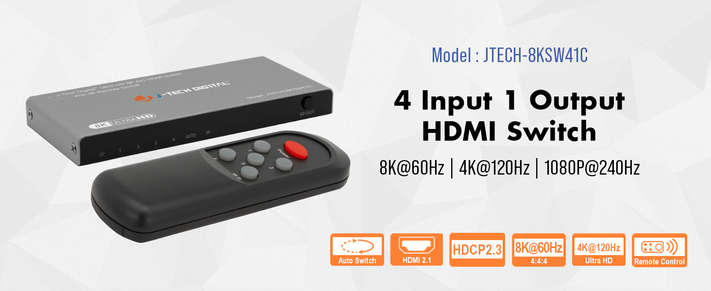 The JTECH-8KSW41C 4x1 HDMI switch allows you to connect 4 UHD sources devices to 1 display, while giving you the ability to easily switch between one of the other. Use either manual or auto switching mode to easily toggle between your input devices. The switch supports 8K @ 60Hz, 4K @120Hz, and 1080P @ 240Hz resolutions, along with support for HDR and Dolby Vision, allowing you to get immersed within your content. Latest HDMI 2.1 features such as VRR, ALLM, and QFT ensure that you get the full gaming experience.