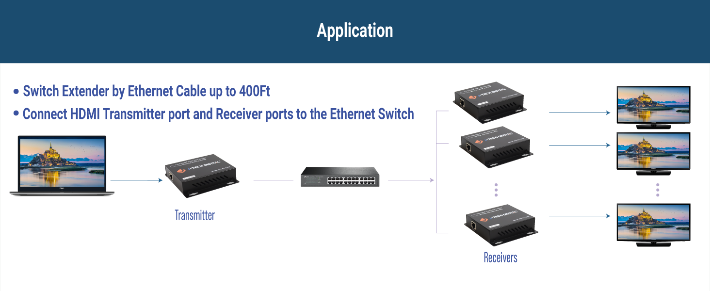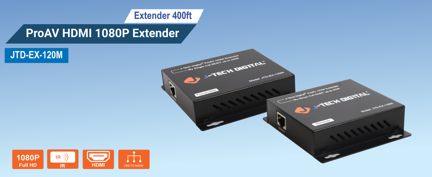 J-Tech Digital proudly introduces this HDMI Extender Over Single CAT5e/CAT6 Cable 1080p with IR - Up to 400 FT. This professional signal transmission system which combines the function of HDMI signal conversion, reception and reduction over a long range without loss in quality. One twisted pair up to 400 feet (CAT6) can be extended indefinitely.