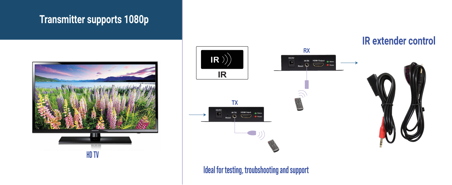 Converts HDMI signals to standard TCP/IP and with the help of network devices, the transmission distance is virtually unlimited The JTD-EX-120M features HDMI network extender, IR synchronization technology,IR Frequency 38KHz-56KHz, Network splitter technology and Network extension technology.