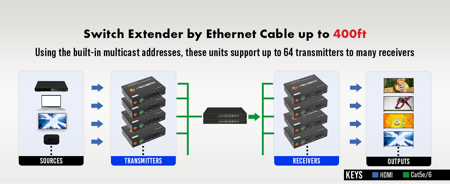 This extender encodes and decodes HDMI signals using H.264 compression, which significantly reduces the bandwidth usage while maintaining high video quality. These H.264 extenders can be used on your home network as long as your network router supports IGMP functionality.