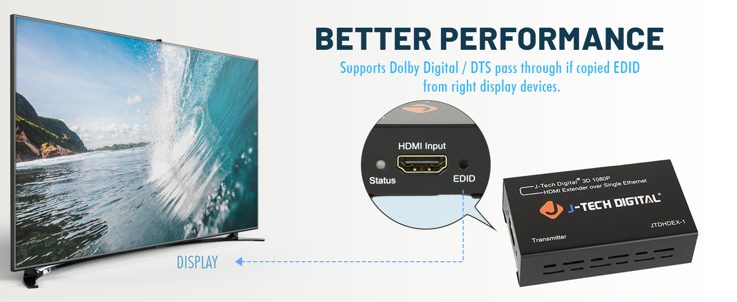 The JTDHDEX-1 HDMI over single ethernet extender is able to extend a 1080P 60Hz audio/video signal up to 150ft., which is four time the transmission distance of a typical HDMI cable. Enjoy deep color video and lossless compressed audio, and utilize the EDID copy function to eliminate any incompatibility issues that may occur within the setup. The JTDHDEX-1 is a great addition to an A/V distribution room, and it's easy installation make it perfect for any residential or commercial installation.