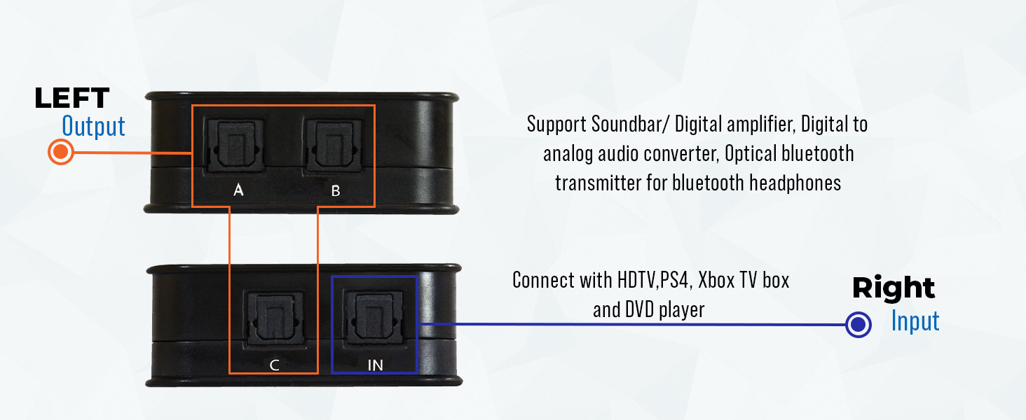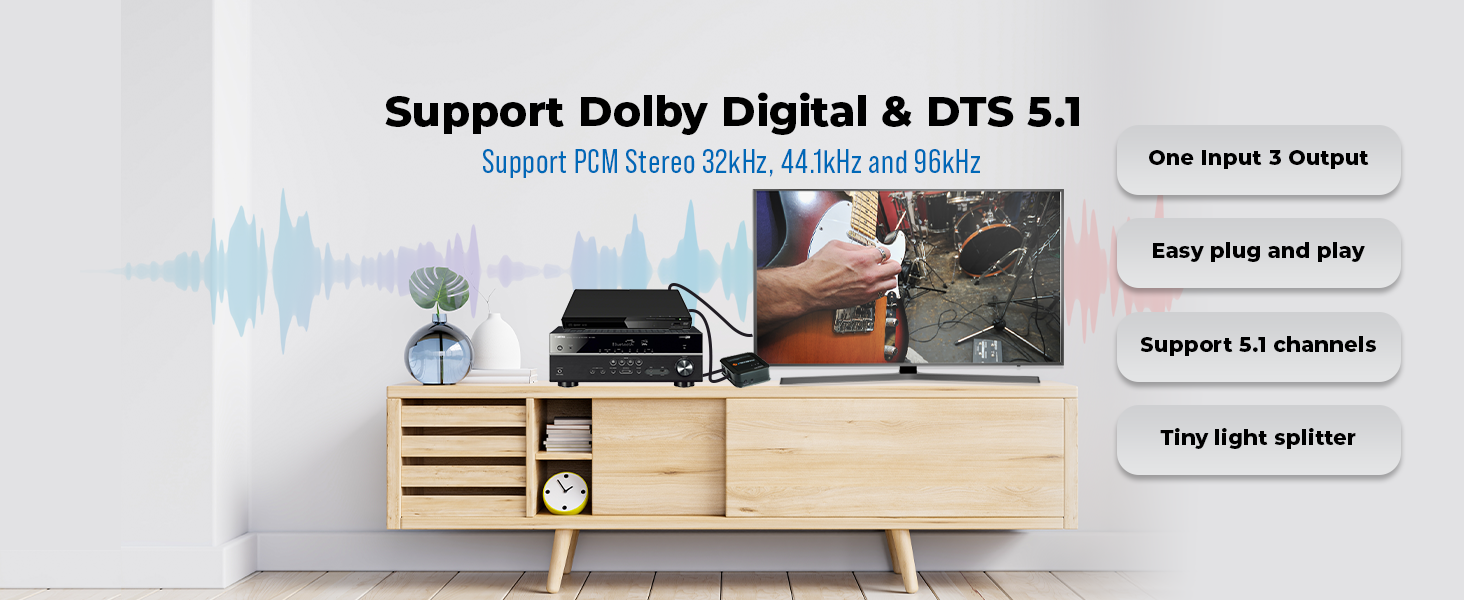 Easily share one optical audio source with up to three devices using this 1x3 Toslink SPDIF Optical Audio Splitter. Designed for clarity and reliability, it supports Dolby Digital, DTS 5.1, and PCM Stereo audio formats (32kHz, 44.1kHz, 48kHz, and 96kHz) for rich, high-quality sound.