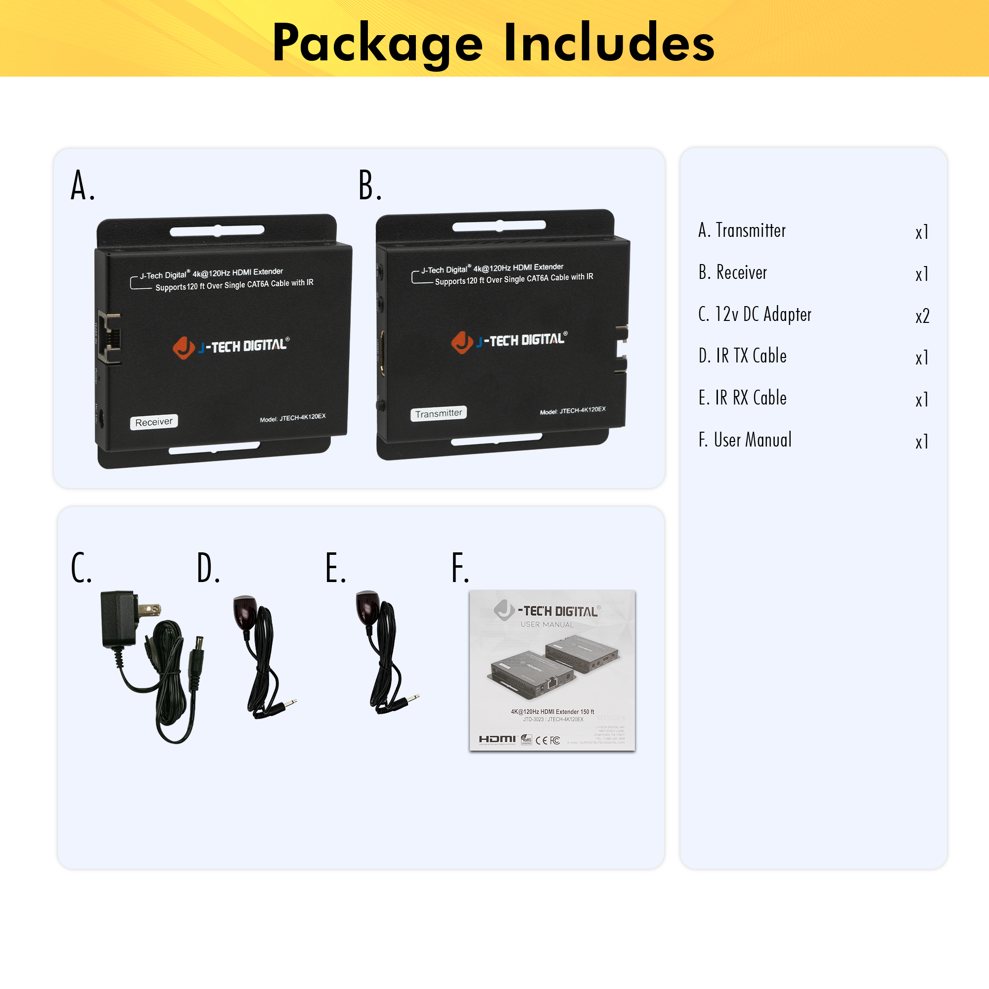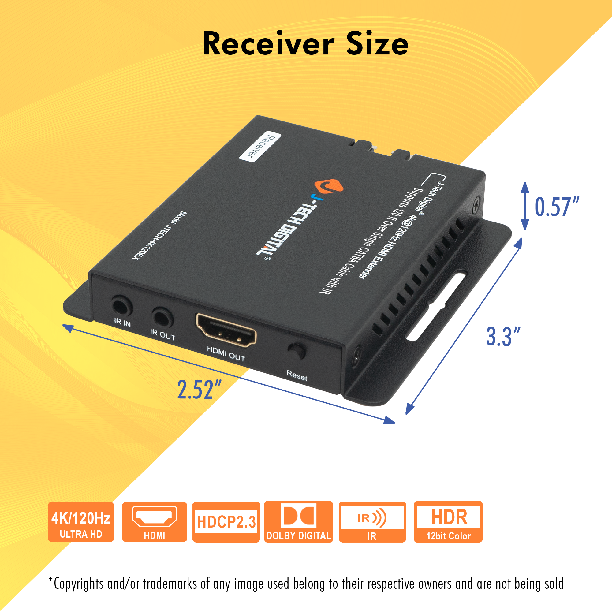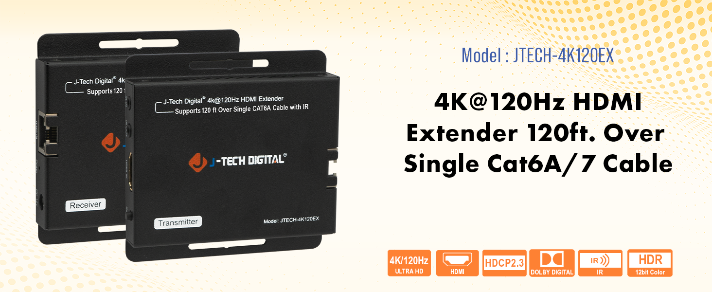 The JTECH-4K120EX HDMI over Ethernet extender helps deliver 4K UHD resolution at 120Hz up to 120ft. over a single CAT 6A/7 cable. With support for HDR, you can now enjoy your favorite content in its full glory at 4 times the distance compared to a standard HDMI Cable. Bi-directional IR feature allows you to control your source device from the display’s location using the source devices remote, or control your display from the source device’s location using the display remote.