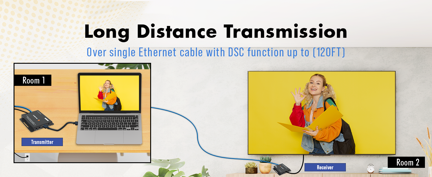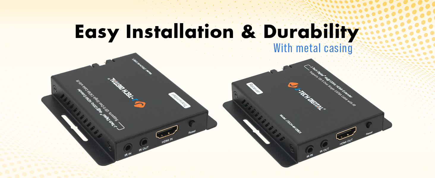 Take advantage of the 2 EDID settings provided by the JTECH-4K120EX extender. Choose between “STD” mode for 4K 120Hz, or use the “TV” mode for EDID pass-through to the display. HDCP 2.3 (backwards compatible with 2.2 and 1.4) ensures compatibility with a wide variety of compatible sources and displays. Take advantage of the plug and play function, and integrate JTECH-4K120EX HDMI over Ethernet extender within your setup today!