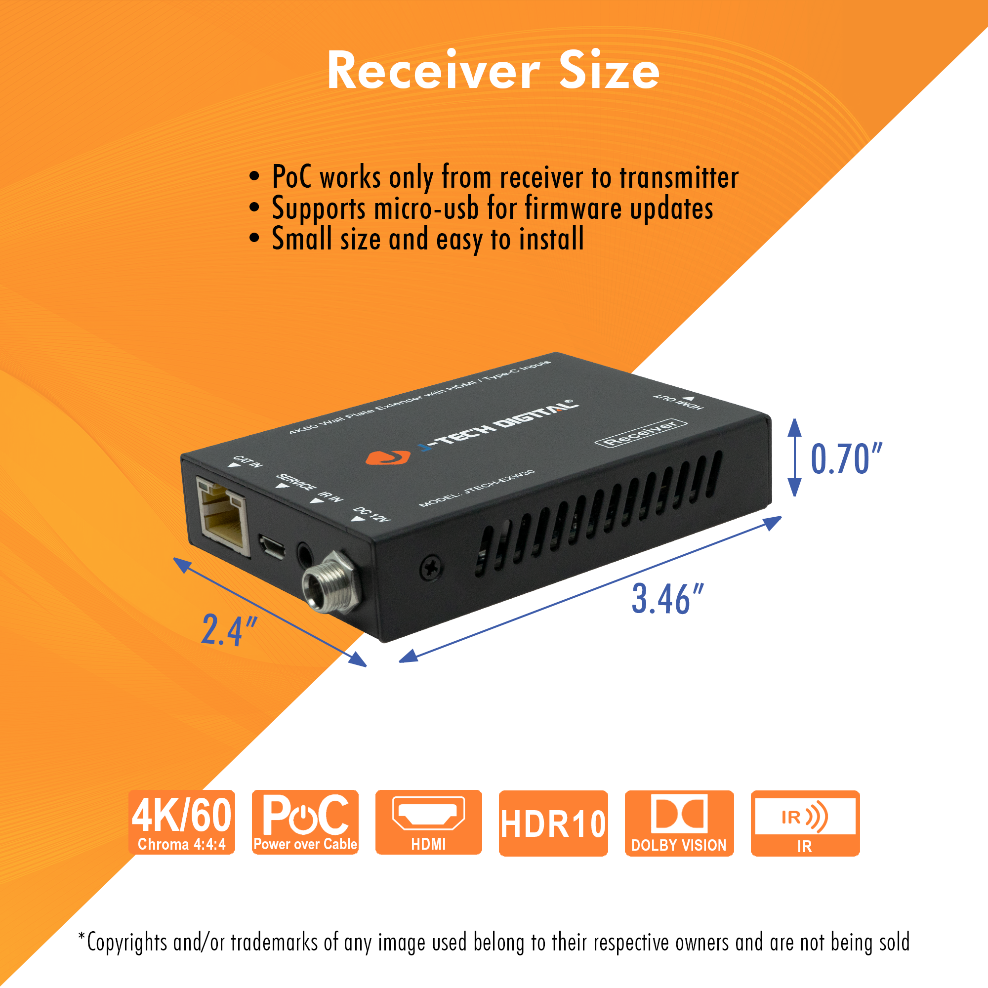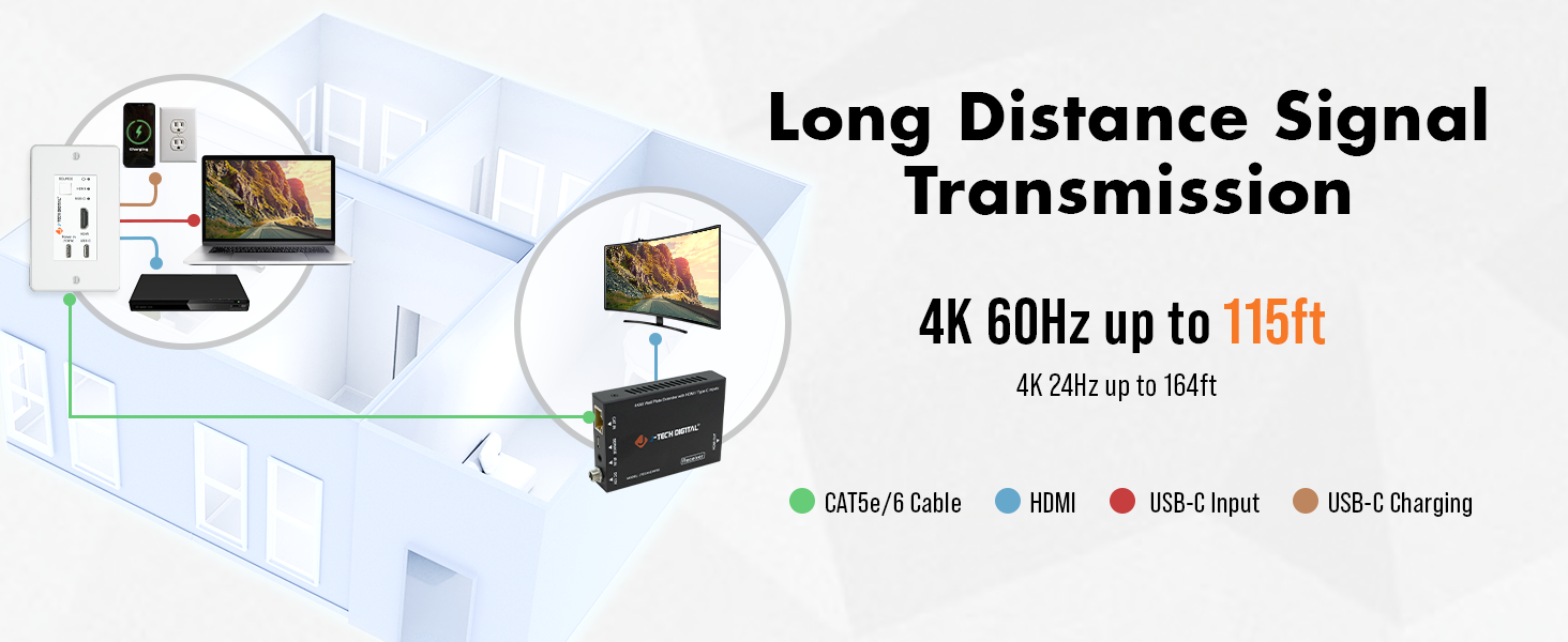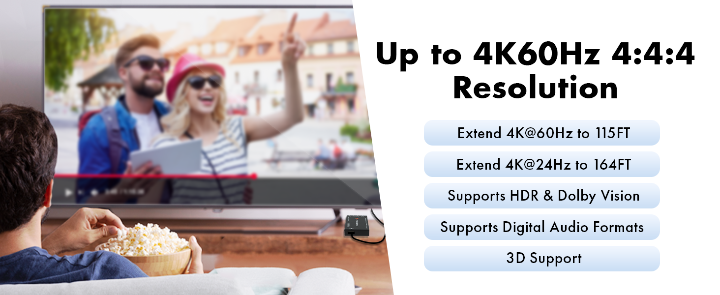 ✅ Features HDMI and USB-C inputs. Extend 4K 60Hz up to 115ft, or 4K 24Hz up to 164ft. over single Cat5e/6/7 cable.