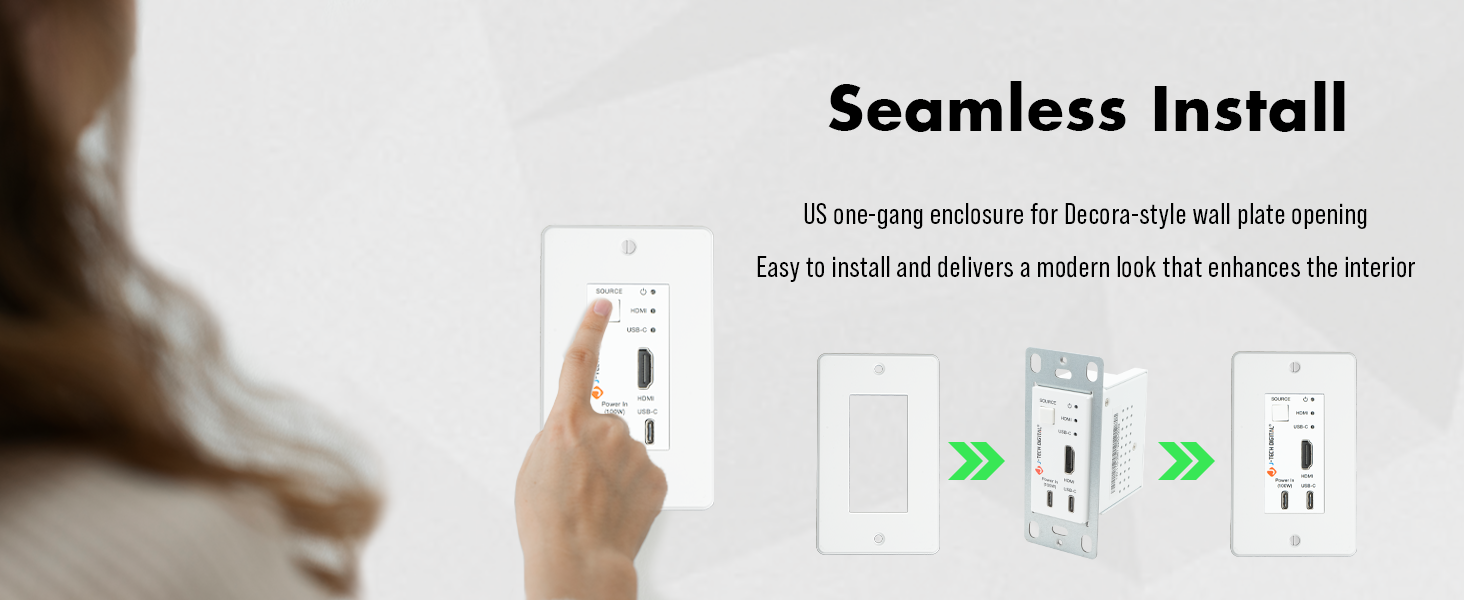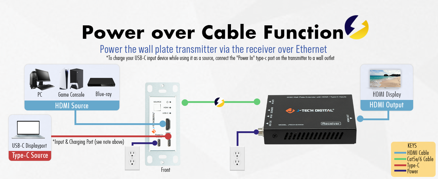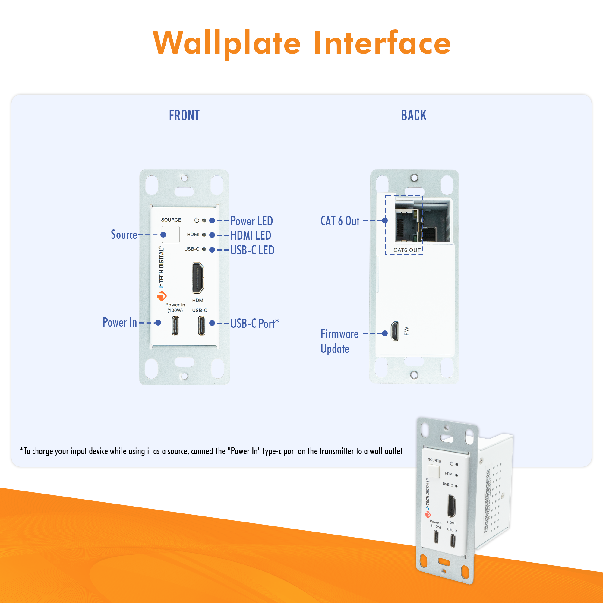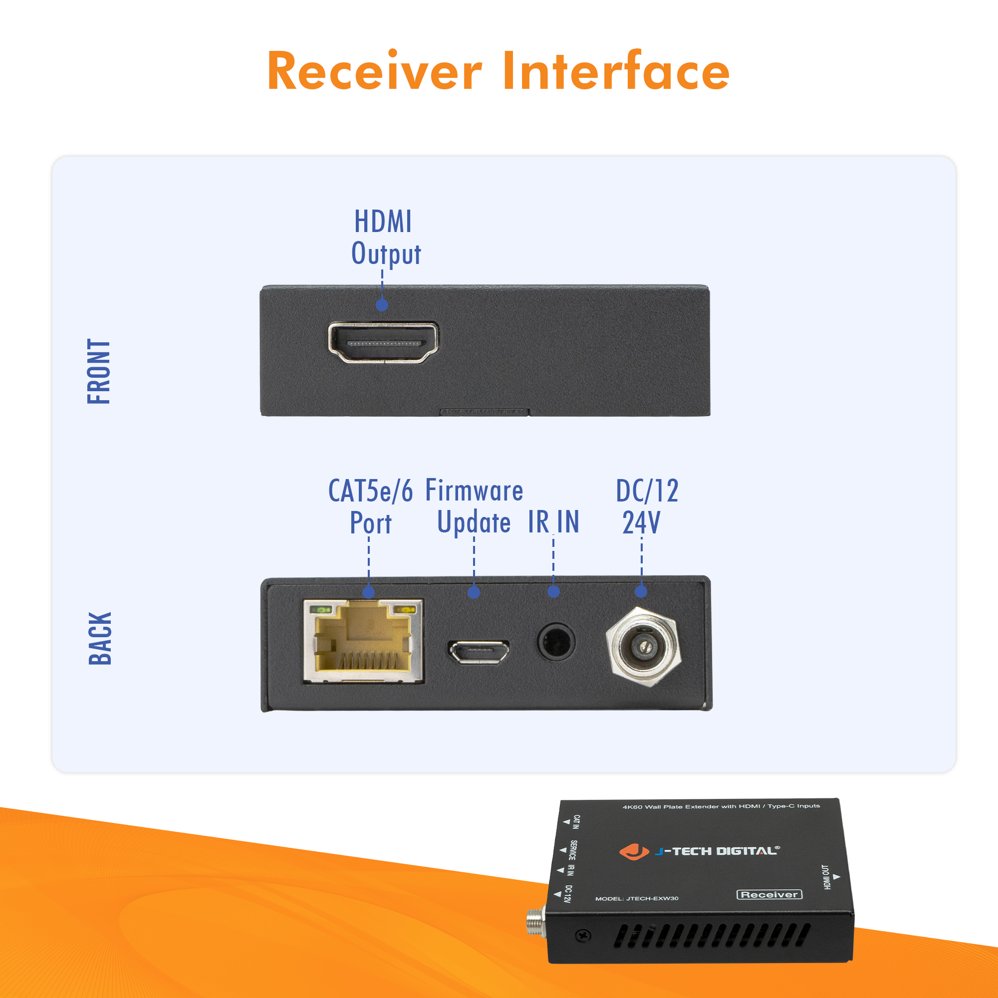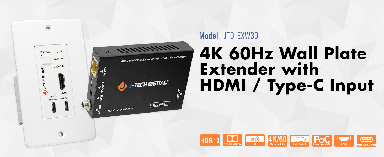 The JTECH-EXW30 wall plate extender can help extend your HDMI or USB-C input signals up to 164ft. over a single Cat5e/6/7 ethernet cable. It also supports up to 4K 60Hz resolution, along with digital audio formats which makes it a great solution for church installs, media rooms, bars/restaurants, conference rooms etc. The JTECH-EXW30 also features power over cable from receiver to transmitter, and a USB-C charging port so that you can charge your source device while using it as an input. US one-gang enclosure for Decora-style wall plate opening makes it convenient to install and use.
