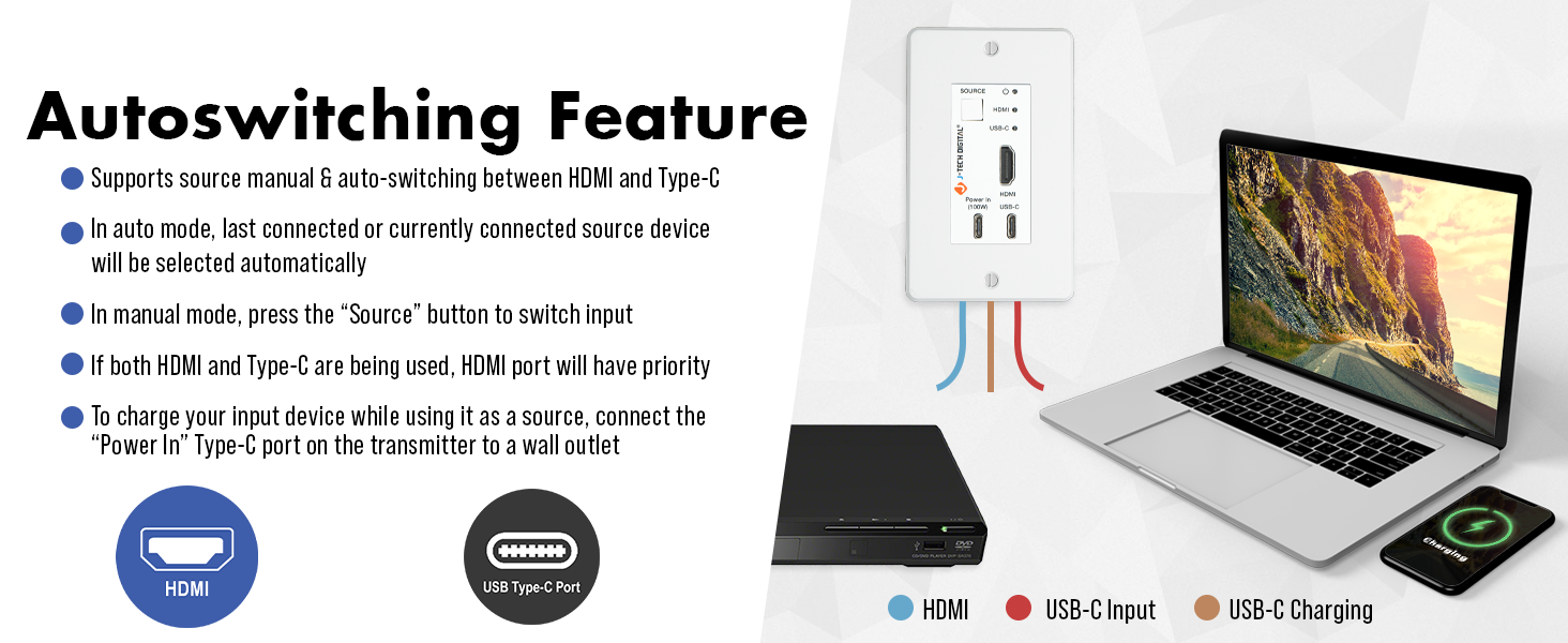✅ Support PoC function from receiver to transmitter. Features manual and auto-switching function between HDMI and USB-C input ports