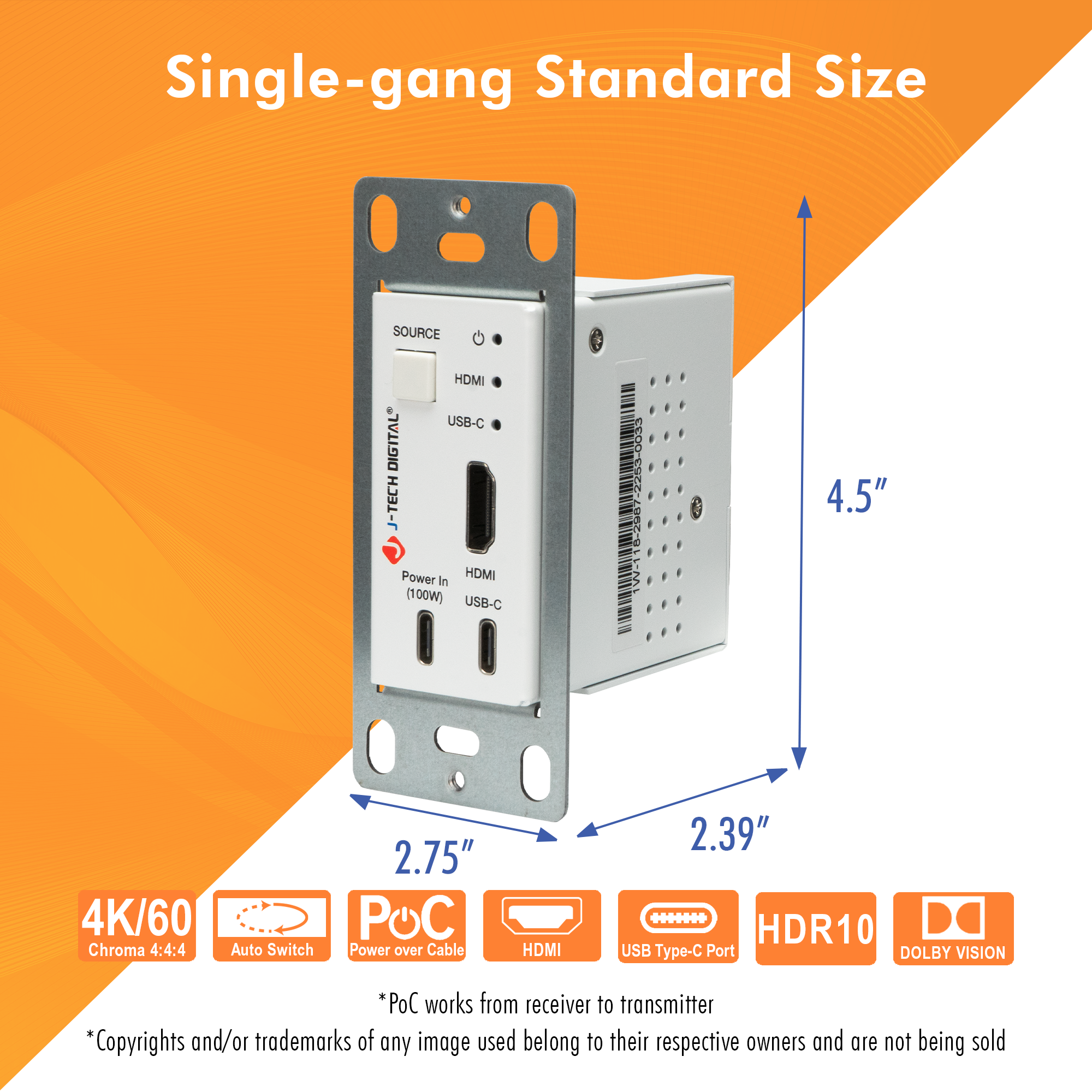 4K 60Hz Wall Plate HDMI Extender Over Ethernet with HDMI/USB-C Inputs and USB-C Charging Port