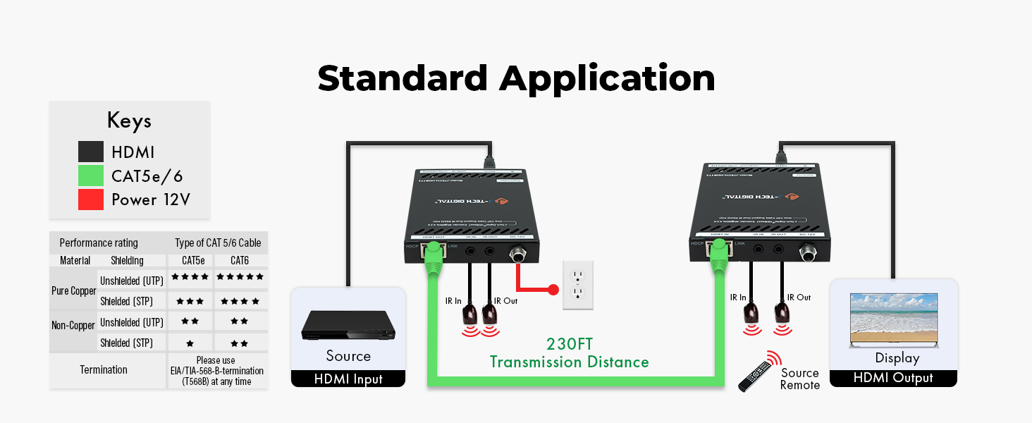 ✅ Bi-directional 5V IR and RS232 pass-through for long-distance control.