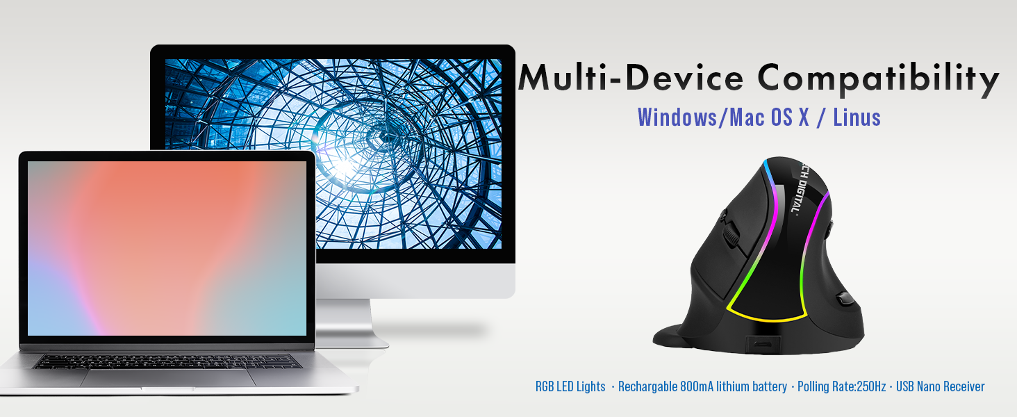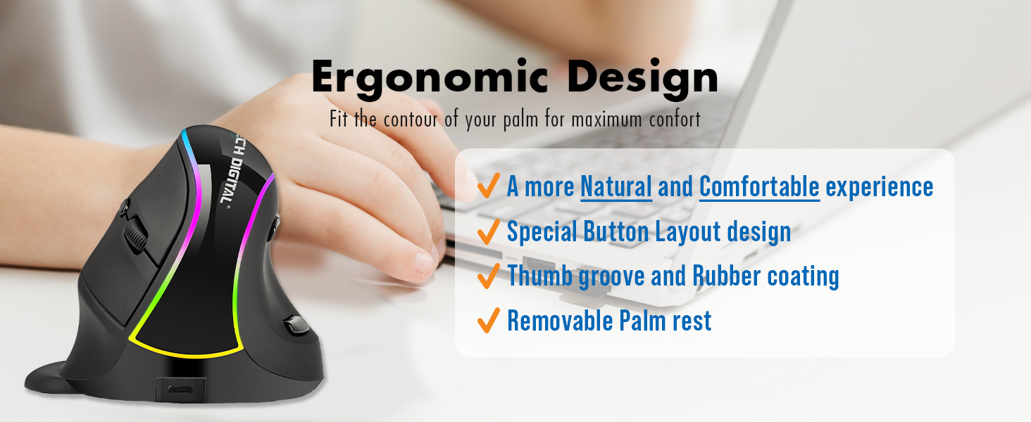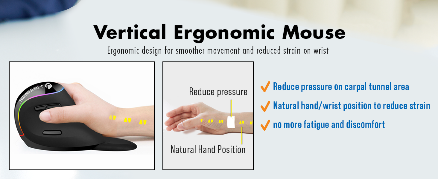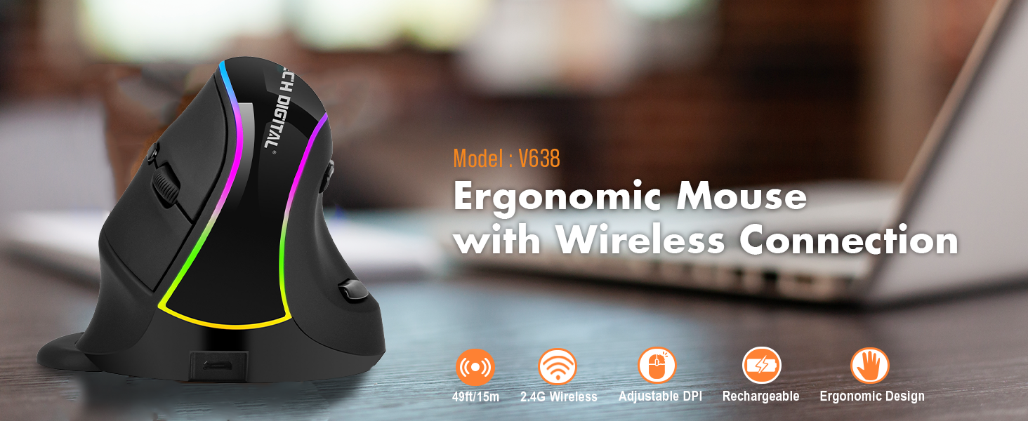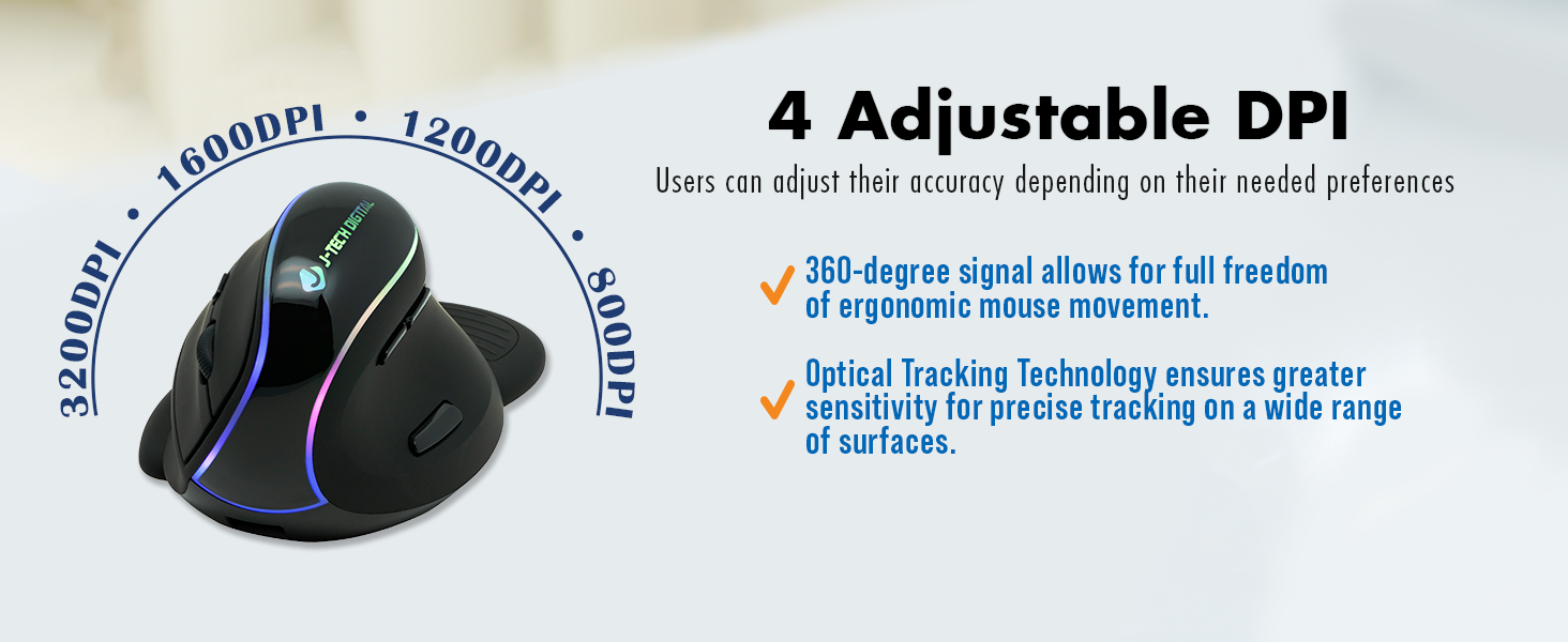 More and more people are discovering the benefits of using an ergonomic mouse. The J-Tech Digital V638 wireless ergonomic mouse is designed to allow for more natural movement, eliminating wrist/hand/arm strain. A detachable non-skid palm rest makes it easy to move the mouse around any non-metallic surface. Wireless connection means users aren’t tethered to their computer by a cable (2.4GHz Wi-Fi connection only). Add in the 360-degree signal, convenient thumb buttons, optical tracking technology, adjustable DPI, rechargeable battery and its compatibility with a wide range of computer operating systems and it’s easy to see why so many people are making the switch to the JTD V638 vertical ergonomic mouse. We understand that the V638’s innovative ergonomic mouse design may be a little intimidating for some users. We urge customers to use their wireless ergonomic mouse over a period of days to get used to its unique feel. We know that once you’ve become familiar with its comfortable, easy to use design, you’ll be asking yourself why you didn’t go ergonomic a long time ago.